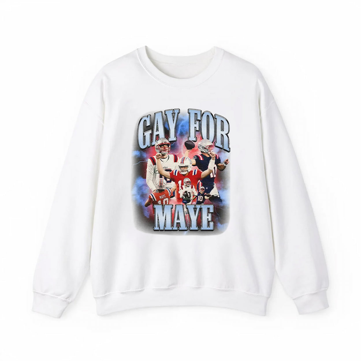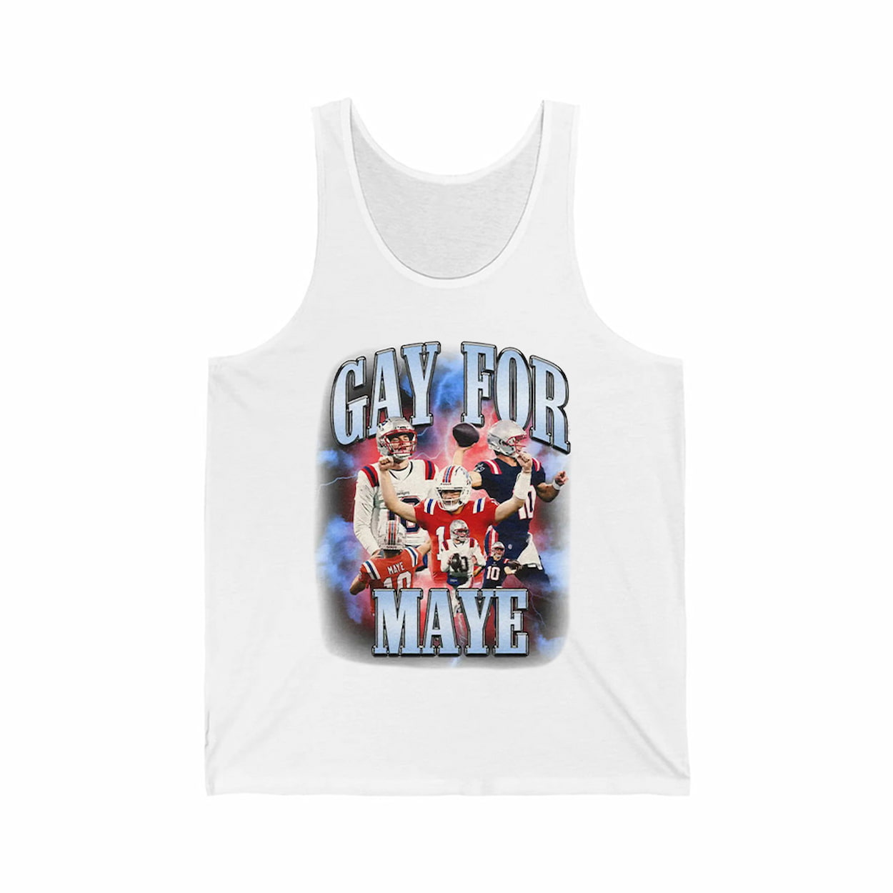 This shirt features a dynamic collage of Maye in action—leaping, passing, and dominating the field in his red-and-white uniform. The backdrop? A stormy blue haze that screams drama. Front and center, the phrase “GAY FOR MAYE” gleams in bold, metallic-style lettering, blending locker room bravado with unapologetic camp. It’s part sports tribute, part pop art, and all attitude.
