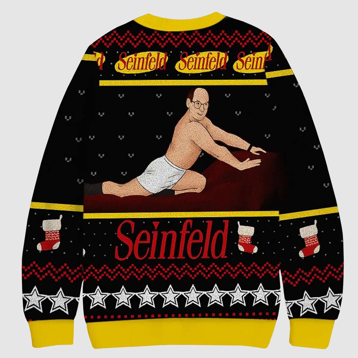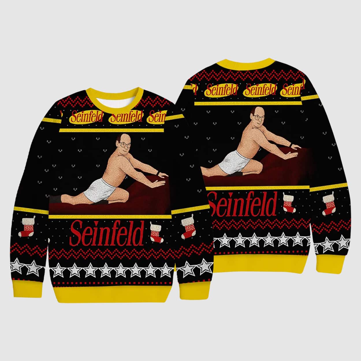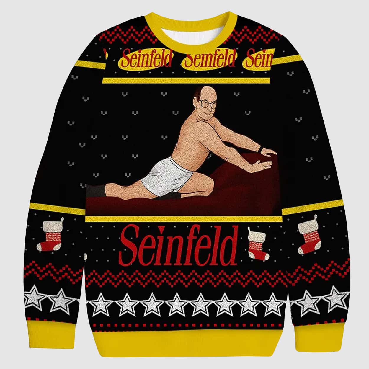 This holiday sweater is a bold homage to one of the most unforgettable scenes in sitcom history. Featuring George Costanza striking a risqué pose in nothing but white underwear, the design is framed by festive patterns of snowflakes, stockings, and stars. Above the image, the word “Seinfeld” is repeated three times in bright yellow, while “Seinfeld” anchors the bottom in bold red. The sweater’s black base and vibrant accents make it both eye-catching and delightfully inappropriate—perfect for fans who love their holiday cheer with a side of cringe comedy.