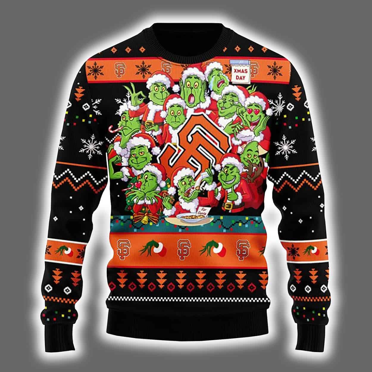 Get into the mischievous holiday spirit with this sweater! This playful black sweater is covered in traditional festive patterns—snowflakes, zigzags, and Giants-orange stripes. The centerpiece is a hilarious graphic on the front: a crowd of angry, green Grinches, all wearing Santa hats, playfully surrounding the iconic SF Giants logo. A small “XMAS DAY” tag near the collar adds a specific holiday touch. The classic orange and black team colors are woven throughout the festive patterns on the sleeves, hem, and back, creating the perfect blend of holiday fun and fan pride.