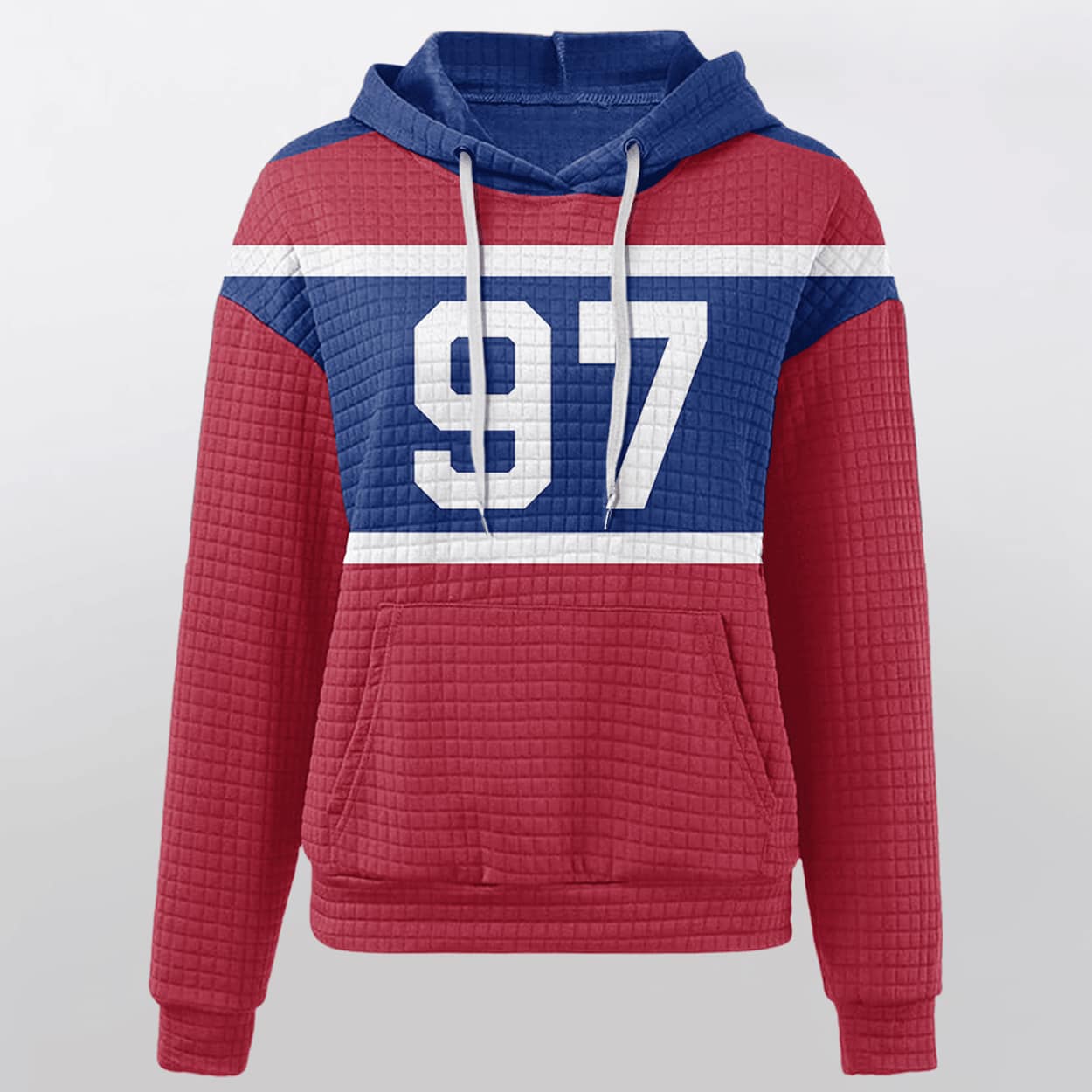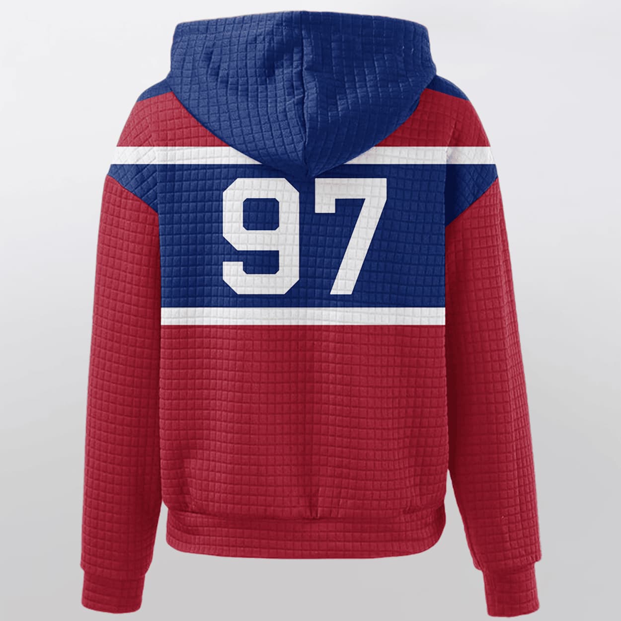 Bring the heat to your fan gear with this hoodie — a striking blend of classic team colors and modern edge. This hoodie roars in red and blue, with the number 97 boldly stamped front and back in crisp white. A horizontal blue stripe slices across the chest and back, bordered by clean white lines that frame the digits like a stadium spotlight. The hood pops in deep blue with white drawstrings, and the textured grid pattern adds depth and attitude to every wear.
