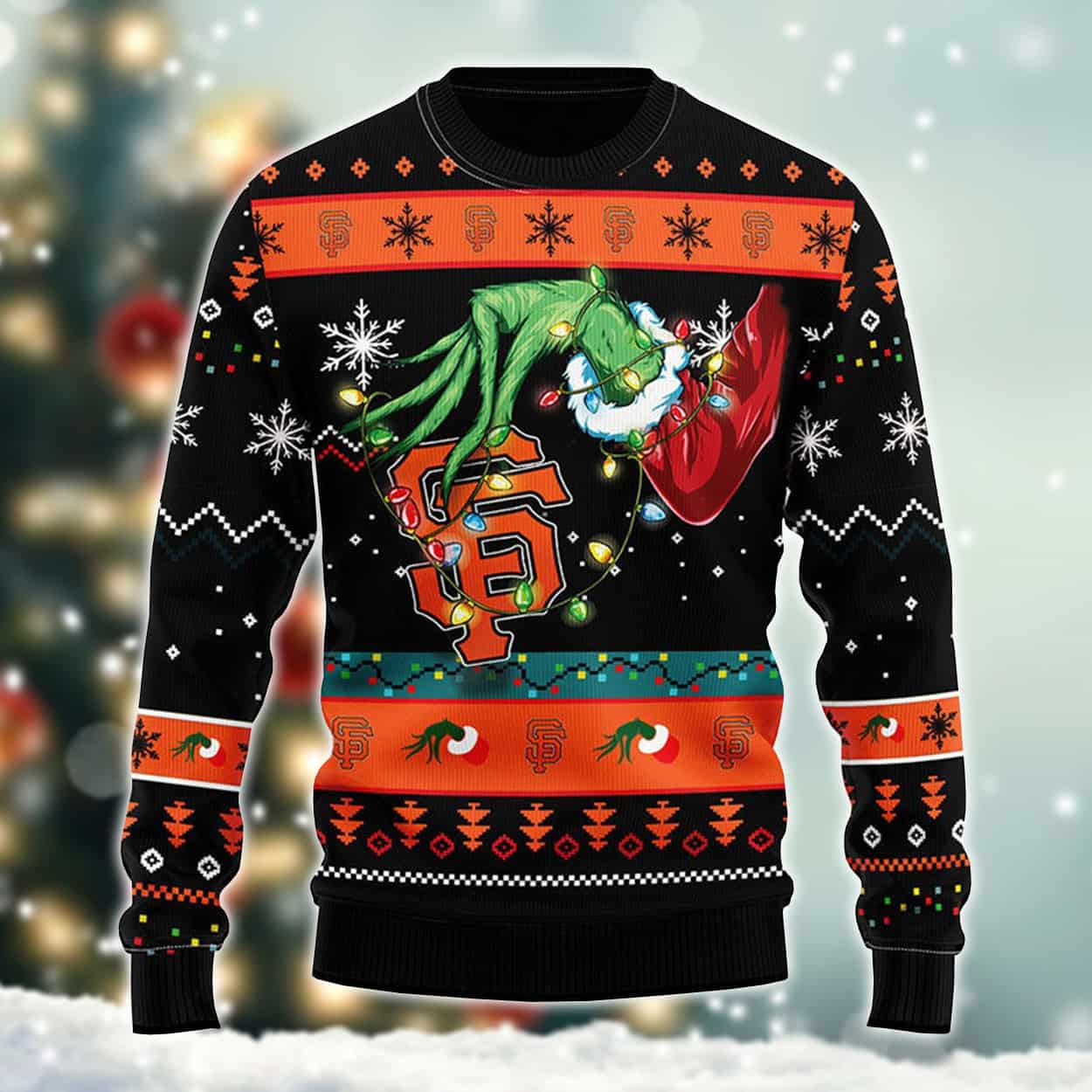 This isn’t your average holiday sweater—it’s a full-blown celebration of sass, sports, and seasonal flair. Set against a bold black backdrop, the sweater bursts with vibrant patterns in orange, red, green, and white. Snowflakes, Christmas trees, and geometric accents dance across the fabric, but the real showstopper is front and center: the Grinch himself, mid-scheme, stringing twinkling lights around the iconic interlocking “SF” logo of the San Francisco Giants. With a mischievous grin and a Santa sack in hand, he’s clearly up to festive no-good—and we’re here for it.