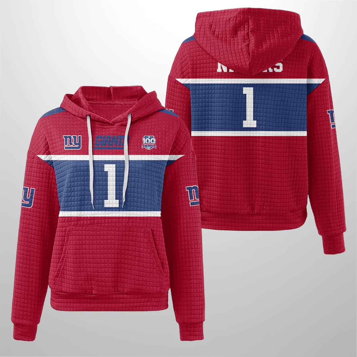 This hoodie is a full-throttle tribute to Giants fandom with a twist of jersey-inspired flair. Bathed in bold red, it features a striking blue-and-white horizontal stripe across the chest and back, framing the crisp white number “1” front and center. The front also sports the classic Giants logo on both sleeves and the left chest. Flip it around and you’ll find “Nabers” printed above the number “1,” making it clear who you’re backing. With a drawstring hood and front pocket, this hoodie blends comfort with commanding style.