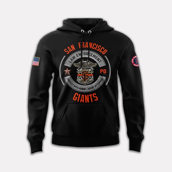 Step up your fan game with the Giants National Law Enforcement Appreciation Day 2025 Hoodie, a must-have for San Francisco Giants supporters who want to salute law enforcement in style. The front proudly displays a circular emblem with “San Francisco Law Enforcement PD” surrounding a star badge, accented by the iconic Giants logo and American flag patches on the sleeves. Flip it around, and the back steals the show with a fierce, helmeted figure gripping a badge, framed by the text “San Francisco Giants” in bold orange—because who says you can’t cheer for your team and honor heroes at the same time?
