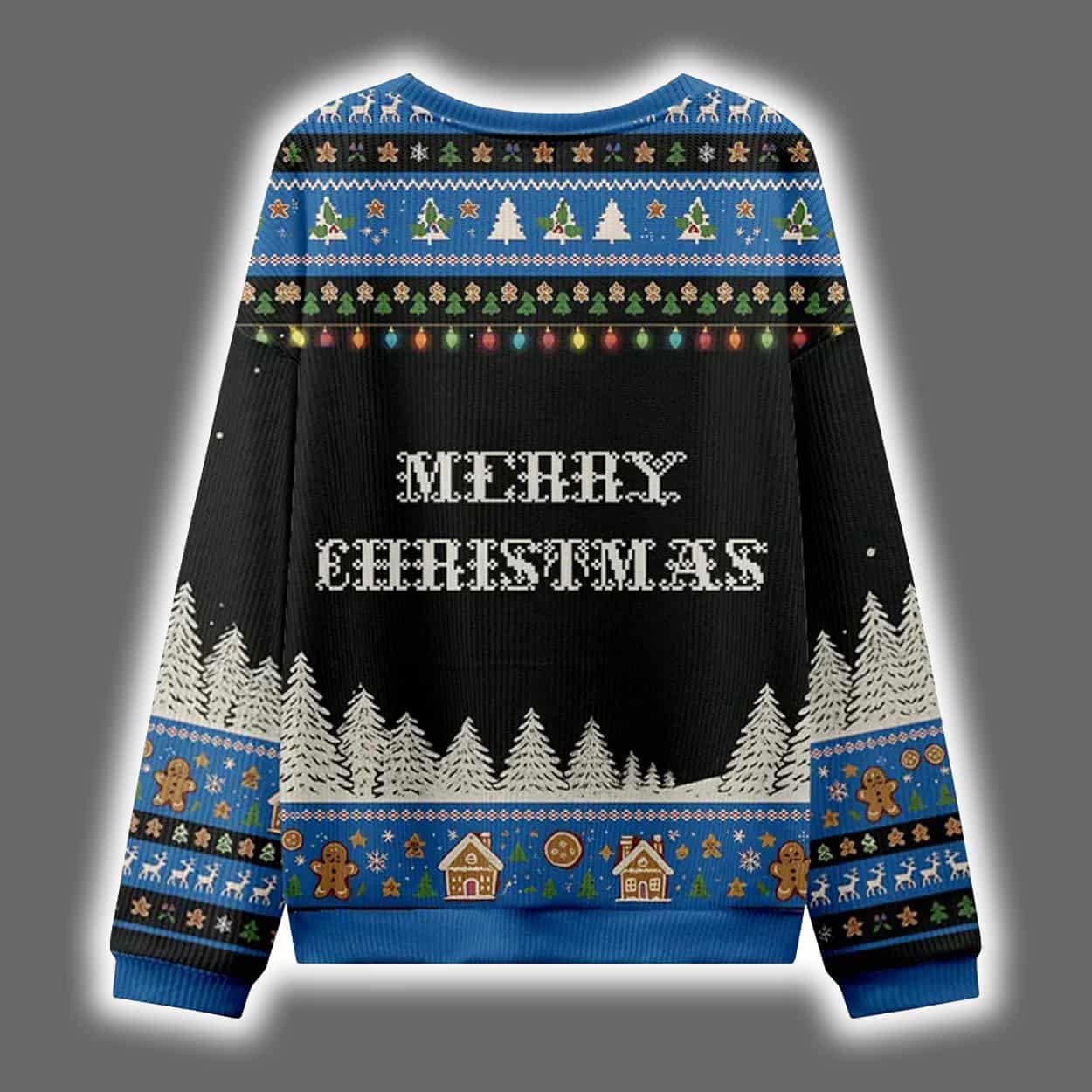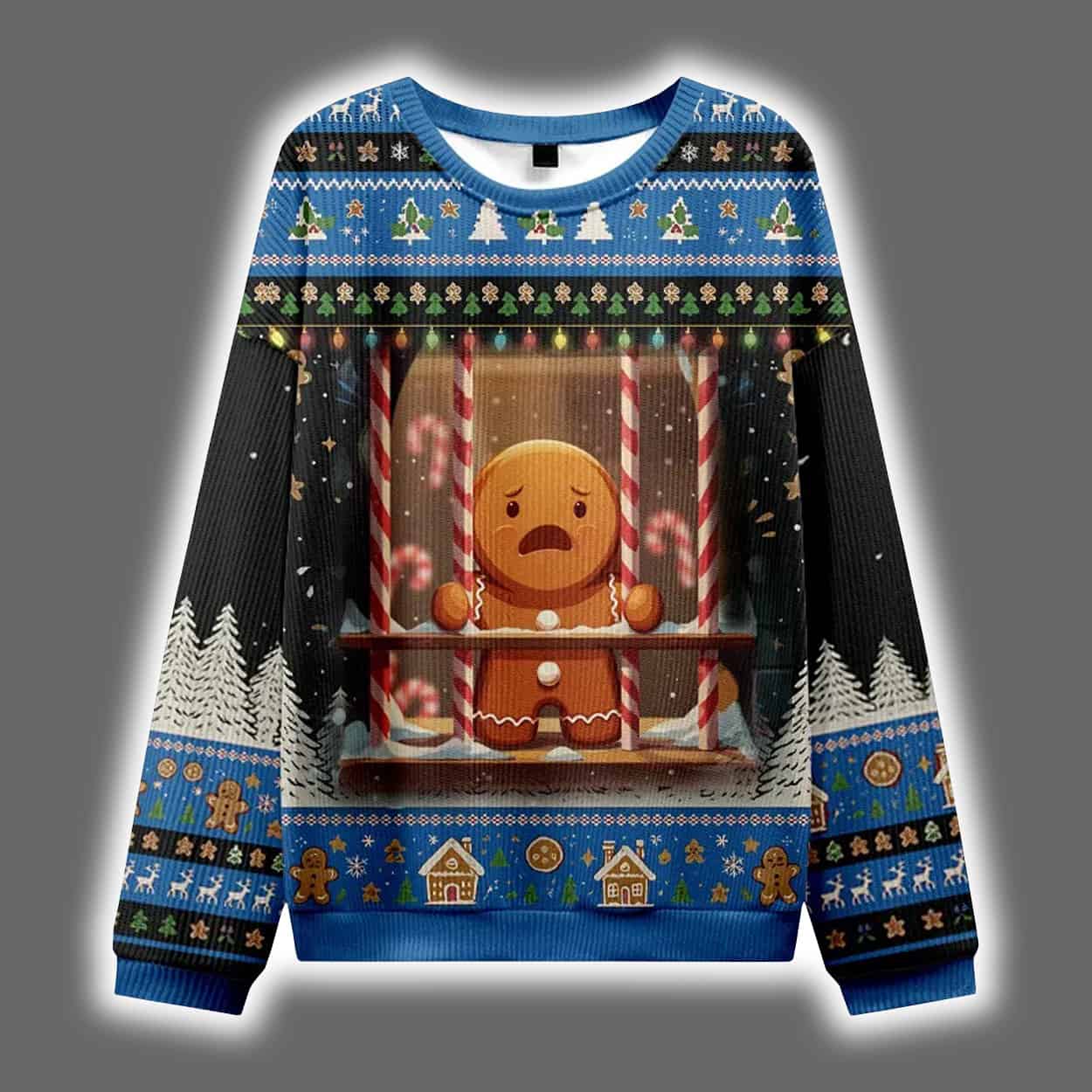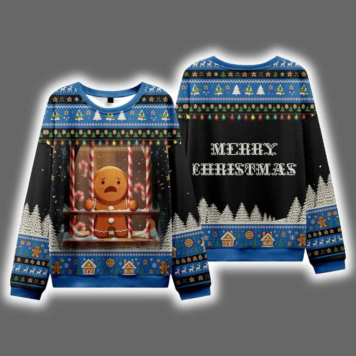 This isn’t your grandma’s Christmas sweater. This sweater is a riotous blend of holiday whimsy and dark humor. On the front, a forlorn gingerbread man peers out from behind candy cane bars—yes, he’s locked up in a sugary jail cell. Surrounding him is a snowy forest dotted with gingerbread houses, adding a frosty charm to the chaos. Flip to the back, and you’re greeted with a bold “MERRY CHRISTMAS” in crisp white letters, framed by the same wintry wonderland. It’s festive, it’s funny, and it’s guaranteed to spark conversation.