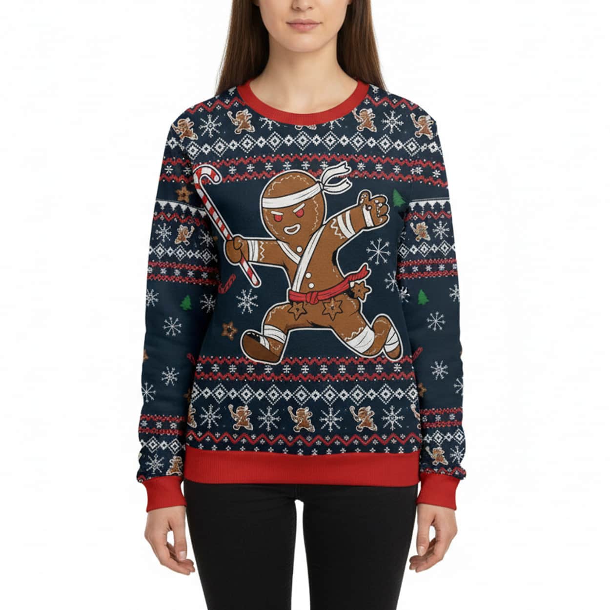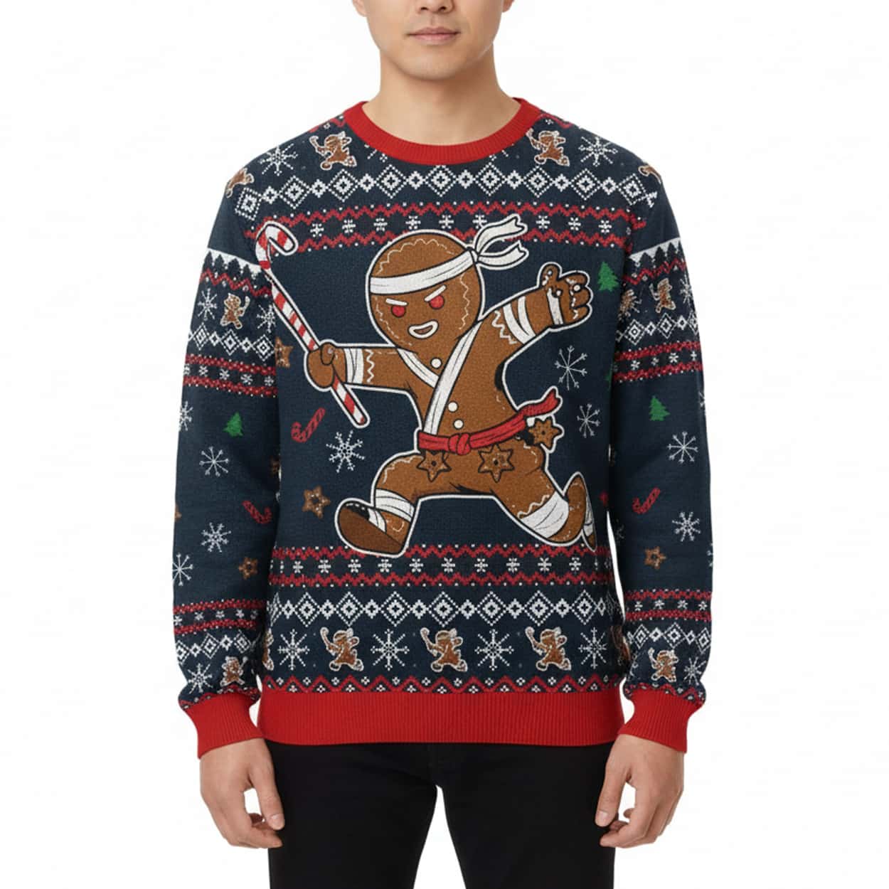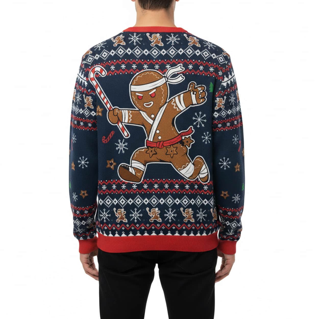 Why settle for a reindeer or a snowman when you can embody a warrior? This design is for the bold, the unconventional, and anyone ready to cut through the holiday monotony. It’s a hilarious mashup of sweet tradition and fierce Japanese warrior spirit, turning the humble cookie into a legendary fighter. This sweater is guaranteed to be a conversation starter and is the perfect uniform for anyone looking to win the ‘ugliest sweater’ contest with sheer, creative audacity.