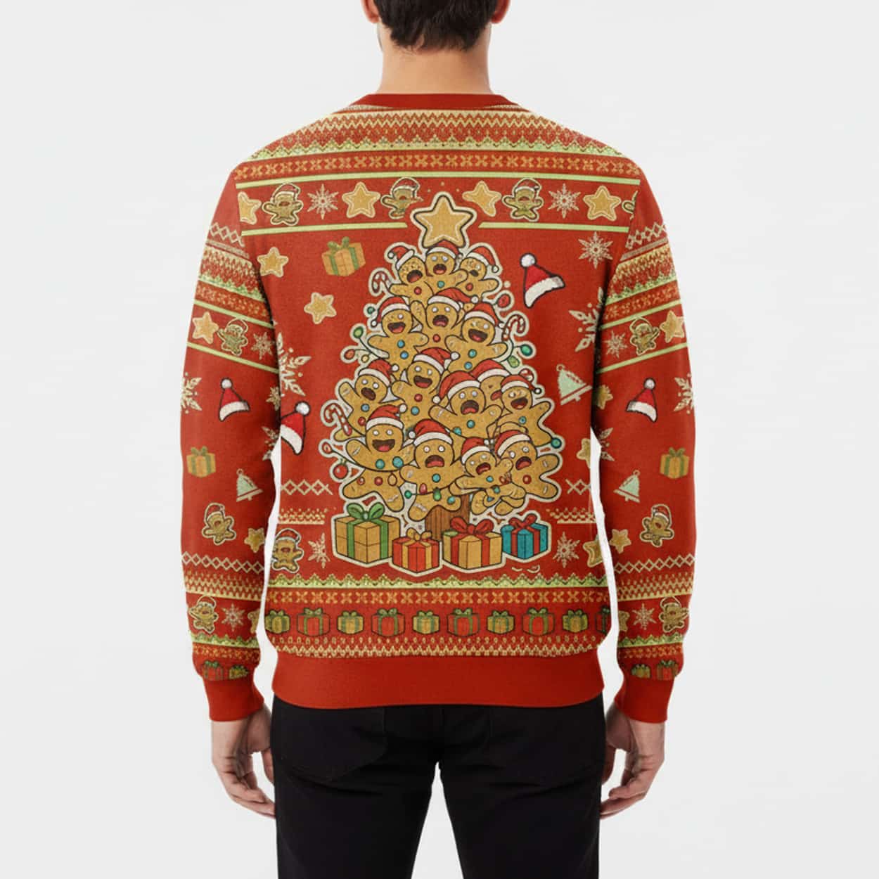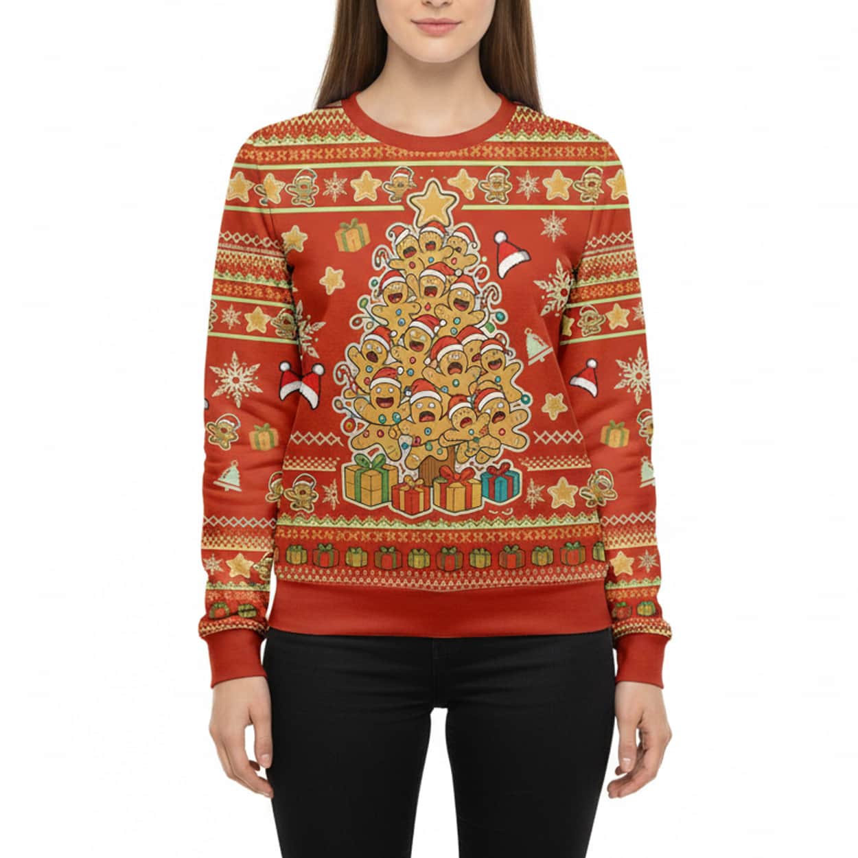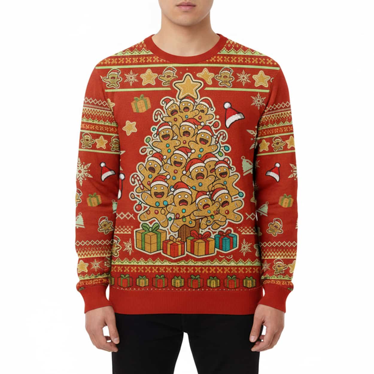 Dive headfirst into holiday cheer with this sweater! Set on a bright, cheerful red background, the central graphic is an immediate attention-grabber: a Christmas tree creatively constructed out of a pile of wide-eyed, slightly frantic-looking gingerbread men. Each little cookie is topped with a festive red Santa hat, and the whole edible-looking tower is crowned with a large, shining star. At the base, a collection of colorful presents adds to the joyous scene, while the sweater’s sleeves and borders are adorned with classic patterns featuring more gingerbread men, snowflakes, and tiny Santa hats.