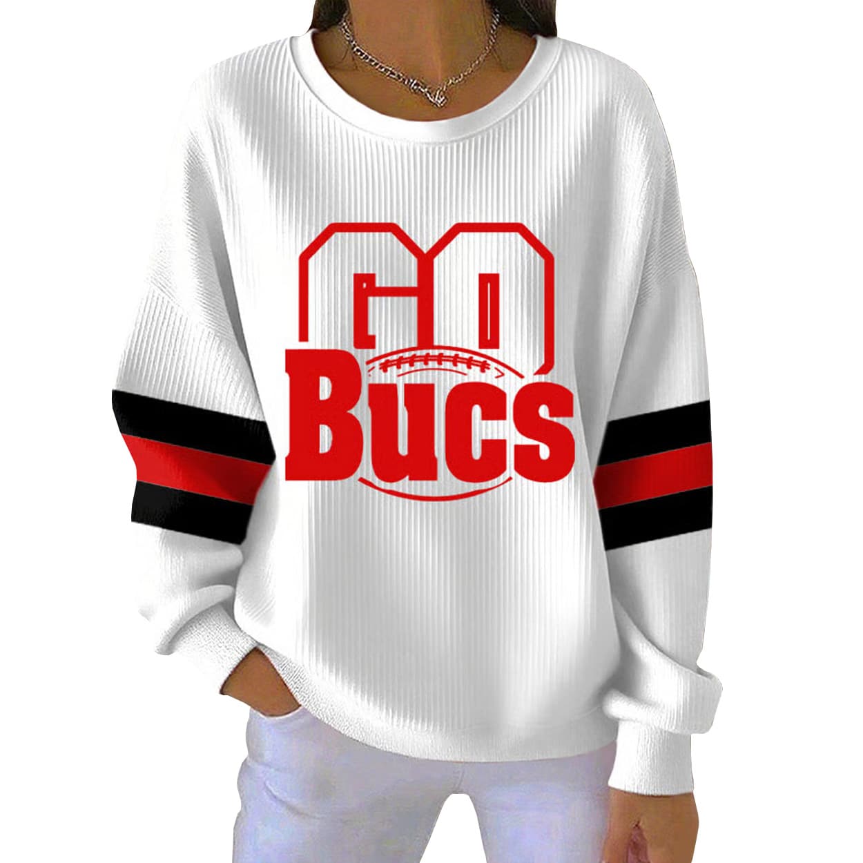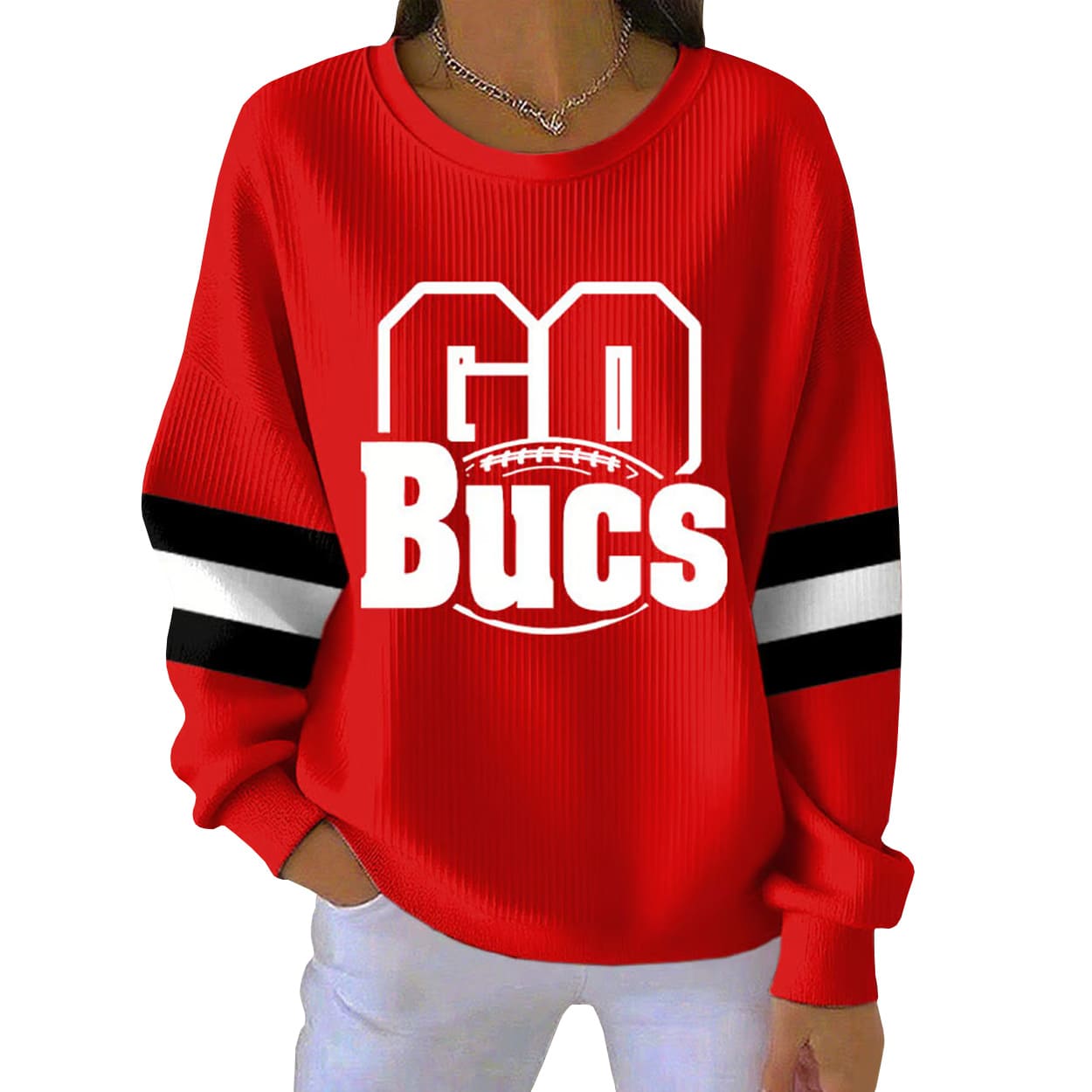 Get ready to rally with this sweatshirt—a vibrant red pullover that screams team spirit. The front features the phrase “GO Bucs” in bold white block lettering, with “Bucs” accented by a football graphic that adds a playful punch. Black and white stripes run down the sleeves, giving it a sporty edge that feels right at home on the sidelines or in the stands. Whether you’re tailgating, lounging, or leading the cheer squad, this sweatshirt brings the heat.