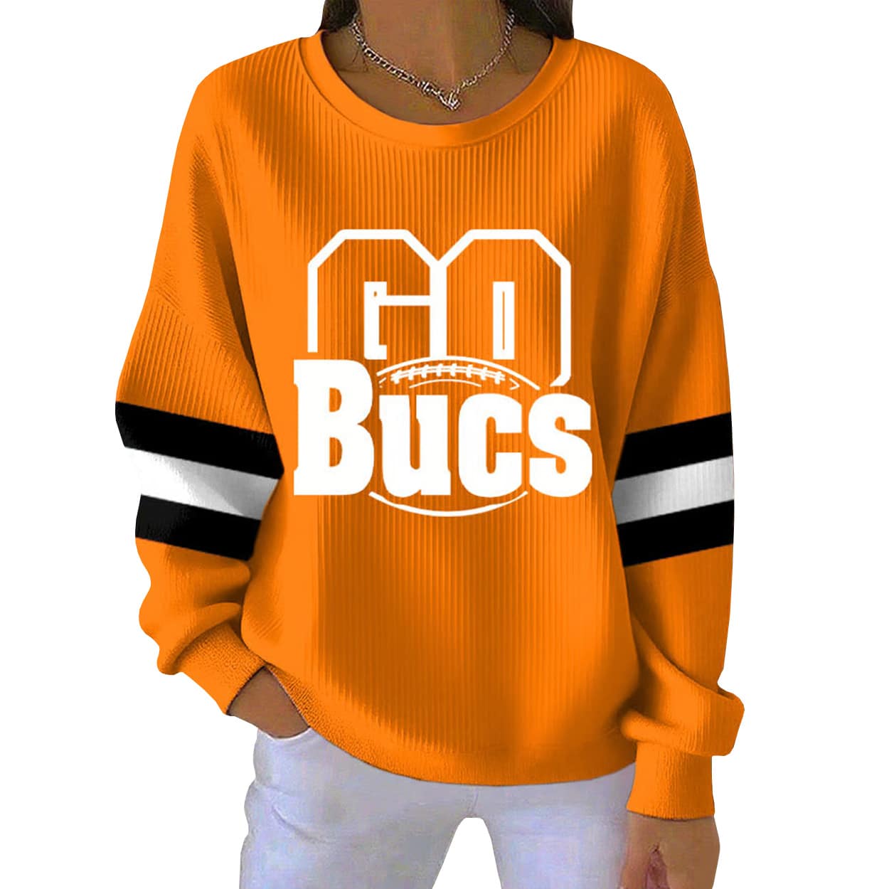 Show off your team pride with the Go Bucs Football Print Pit Striped Sweatshirt—a bold, sporty essential that blends game-day energy with everyday swagger.