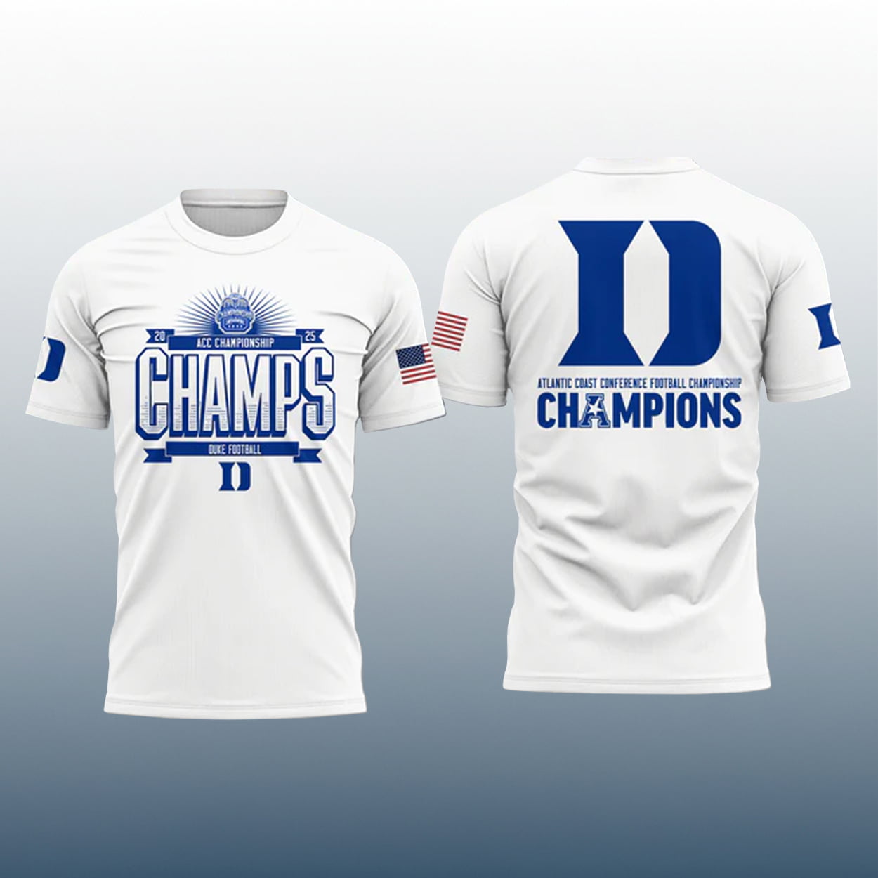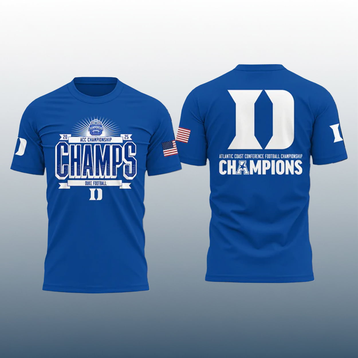 Victory never looked so sharp. This shirt is your front-row pass to championship swagger. On the front, a radiant football helmet graphic beams with pride above the words “2025 ACC CHAMPIONSHIP CHAMPS DUKE FOOTBALL,” anchored by a bold “D” that says it all. Turn it around and the back takes it up a notch with a massive white “D” and the triumphant phrase “ATLANTIC COAST CONFERENCE FOOTBALL CHAMPIONSHIP CHAMPIONS,” complete with a stylized “D” shaped. With patriotic flair on the right sleeve and Duke pride stamped on the left, this shirt is a full-body celebration.