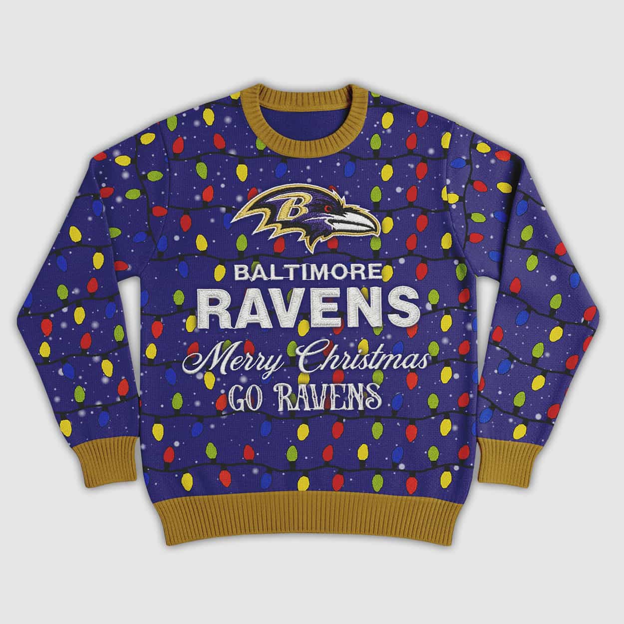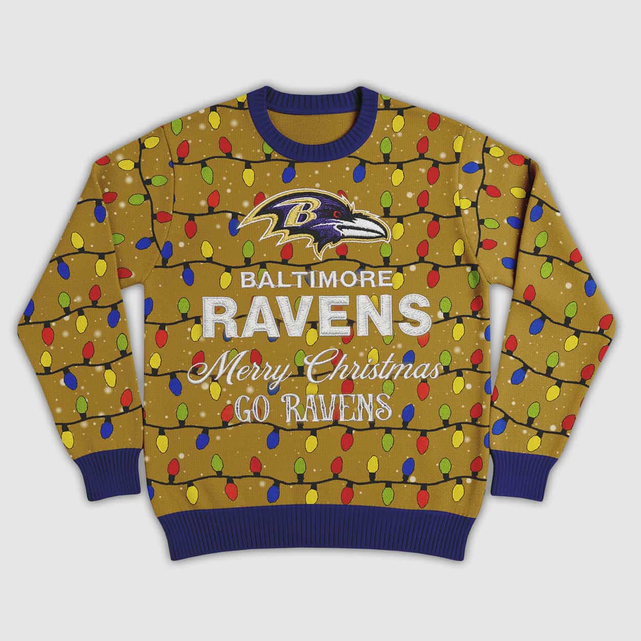 Bring the energy of game day to your holiday festivities with this sweater! This vibrant blue sweater is lit—with a playful pattern of multicolored Christmas lights in red, yellow, and green, strung across the front like a festive celebration. At the heart of the design, the iconic Ravens logo—a fierce raven head with a bold “B”—commands attention. Just below, the message reads: “RAVENS Merry Christmas GO RAVENS,” making it clear where your loyalty lies. Mustard yellow accents on the collar, cuffs, and hem add a punch of contrast that keeps the look fresh and festive.