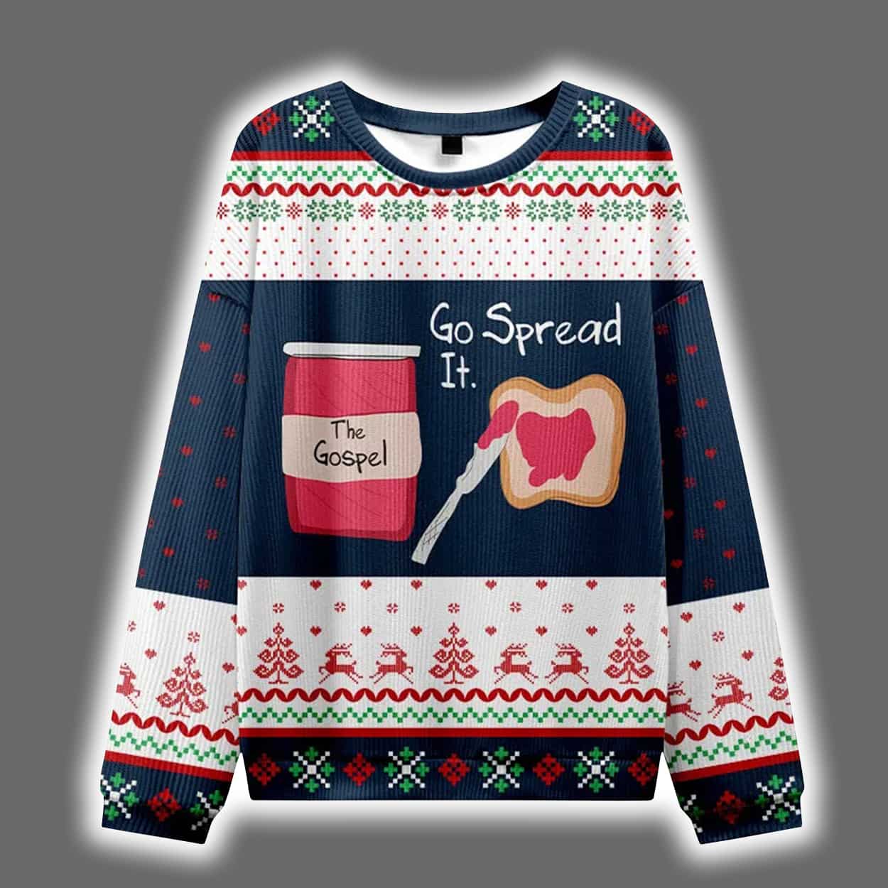 This holiday season, wear your faith with flair in this sweater. Featuring a vibrant navy blue base with classic Christmas motifs—snowflakes, reindeer, and trees in red, green, and blue—this sweater brings the festive vibes in full force. At its heart is a playful graphic: a jar labeled “The Gospel” and a slice of bread being slathered with jelly. Above it, the bold phrase “Go Spread It” delivers a humorous yet meaningful message. Whether you’re at a church potluck, a holiday party, or just spreading joy around town, this sweater is guaranteed to spark smiles and conversations.
