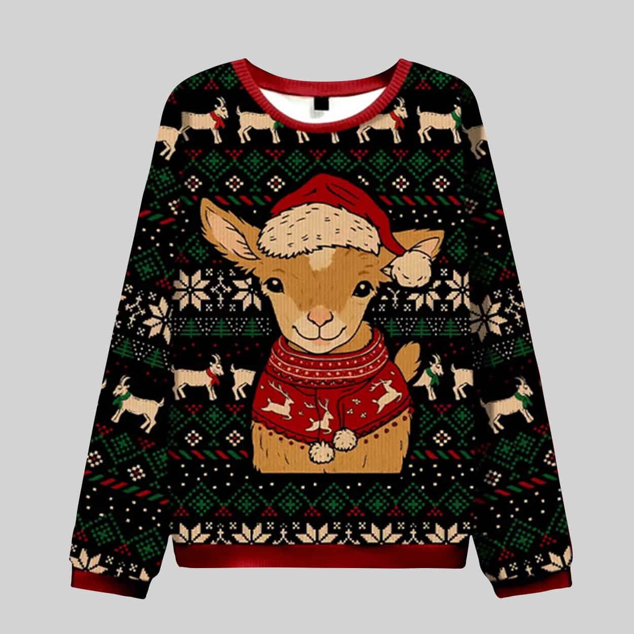 This holiday pullover is a hilarious and charming take on the classic “ugly Christmas sweater.” The festive black sweater features a large, adorable goat as the main star, smiling while wearing a Santa hat and a festive red scarf. The entire pullover is covered in traditional green, white, and red Fair Isle patterns, including snowflakes, geometric designs, and even repeating silhouettes of other goats, all tied together with red trim.