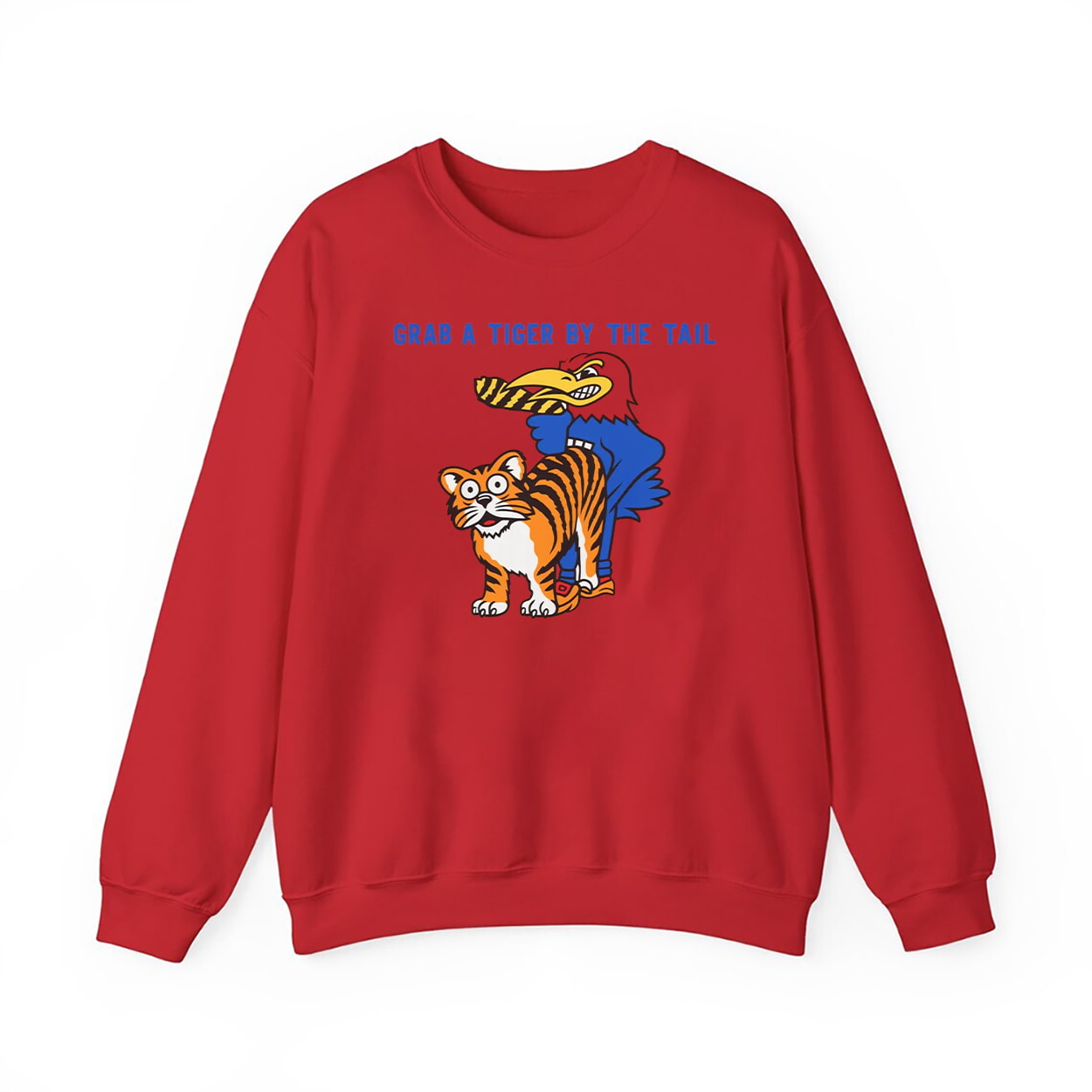 Celebrate the legendary Kansas-Missouri rivalry with the Grab A Tiger By The Tail Shirt—featuring bold vintage artwork and a cheeky Jayhawk victory pose that every KU fan will instantly recognize.
