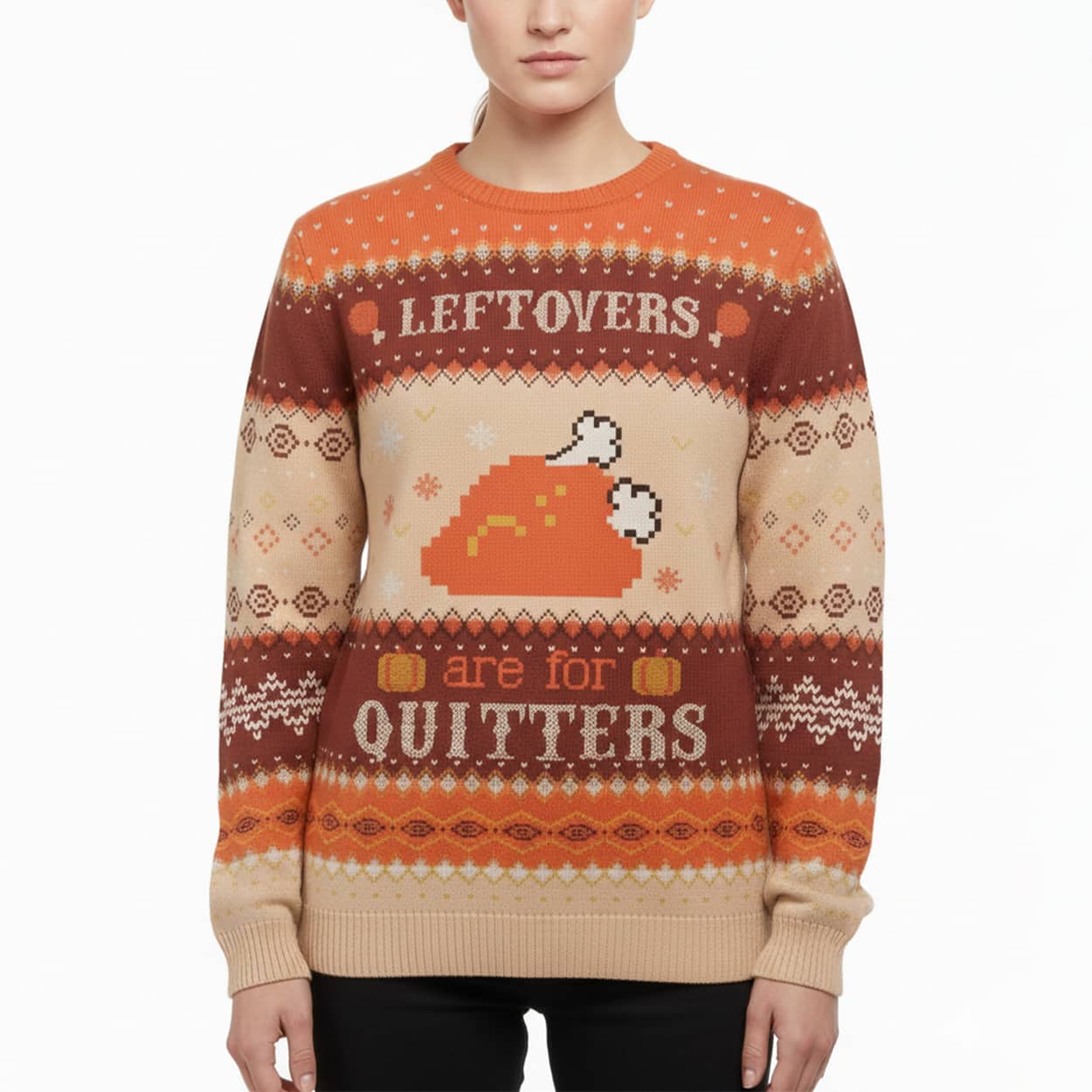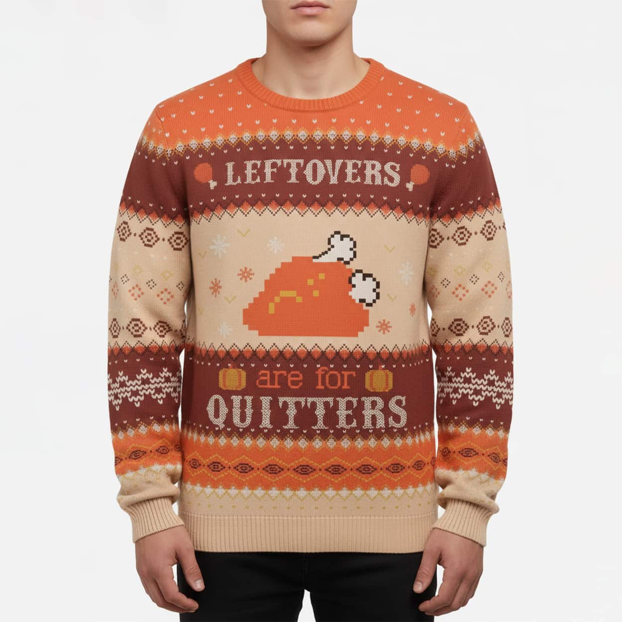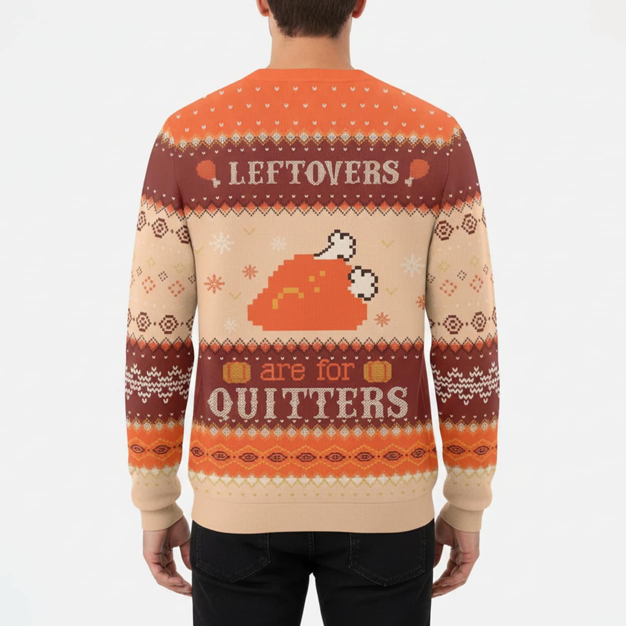 Celebrate Thanksgiving with unapologetic flair in the Grant Leonard Leftovers Are For Quitters Ugly Sweater—a cheeky, pixel-perfect tribute to holiday indulgence.