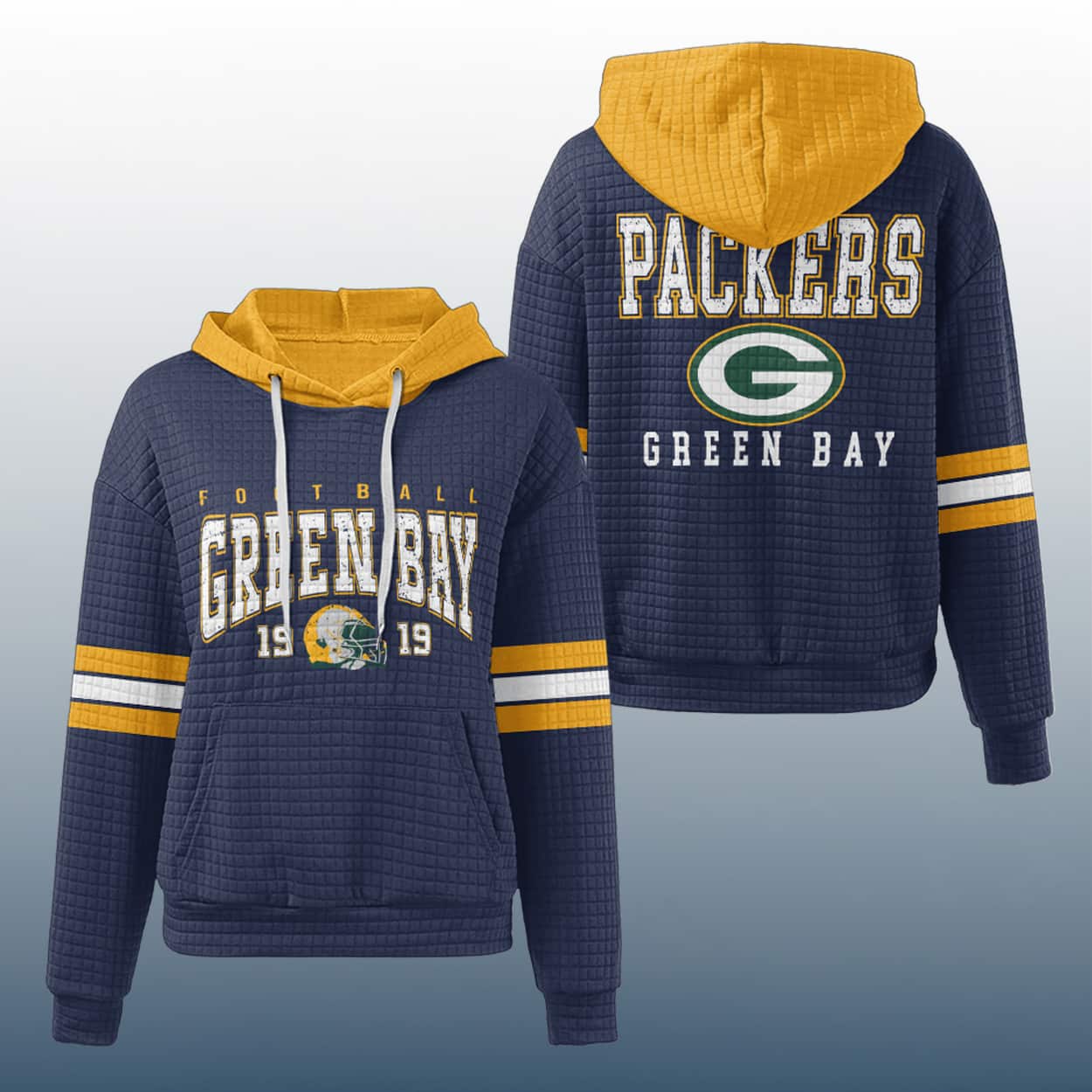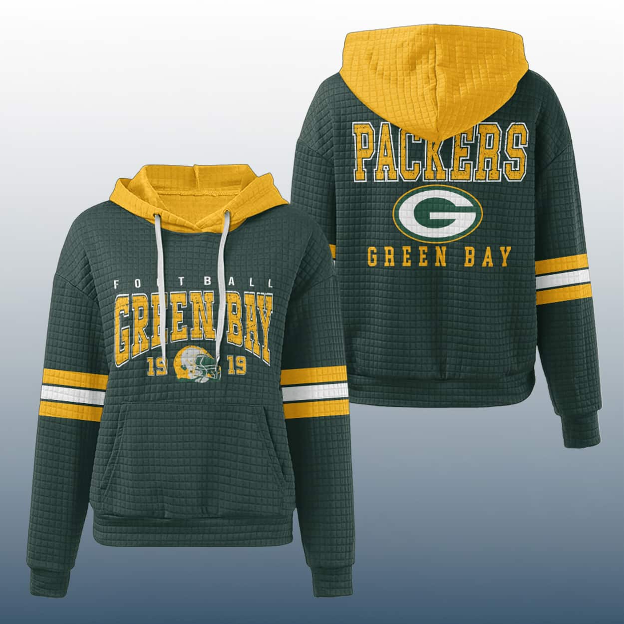 Step into timeless Packers pride with this hoodie. This dark green stunner features bold yellow and white sleeve stripes that scream classic football swagger. On the front, “FOOTBALL GREEN BAY 1919” is stamped in crisp lettering, with the iconic Packers logo tucked proudly beneath “BAY.” Flip it around and you’ll find “PACKERS” boldly printed across the back, split by the unmistakable “G” logo. The yellow-lined hood and white drawstrings add a pop of contrast, while the quilted waffle texture brings depth and dimension to this fan-favorite piece.