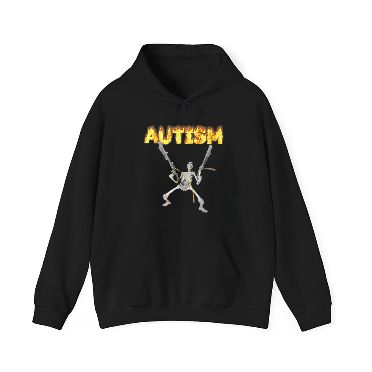 This shirt isn’t just clothing—it’s a declaration. Front and center is a striking skeleton, arms raised high, gripping two gun like a warrior of truth. Above it, the word “AUTISM” blazes in bold, flame-textured lettering, demanding attention and respect. The graphic is intense, unapologetic, and full of energy—just like the voices it represents. Whether you’re marching for change or making a statement in your everyday life, this shirt turns heads and sparks conversations.