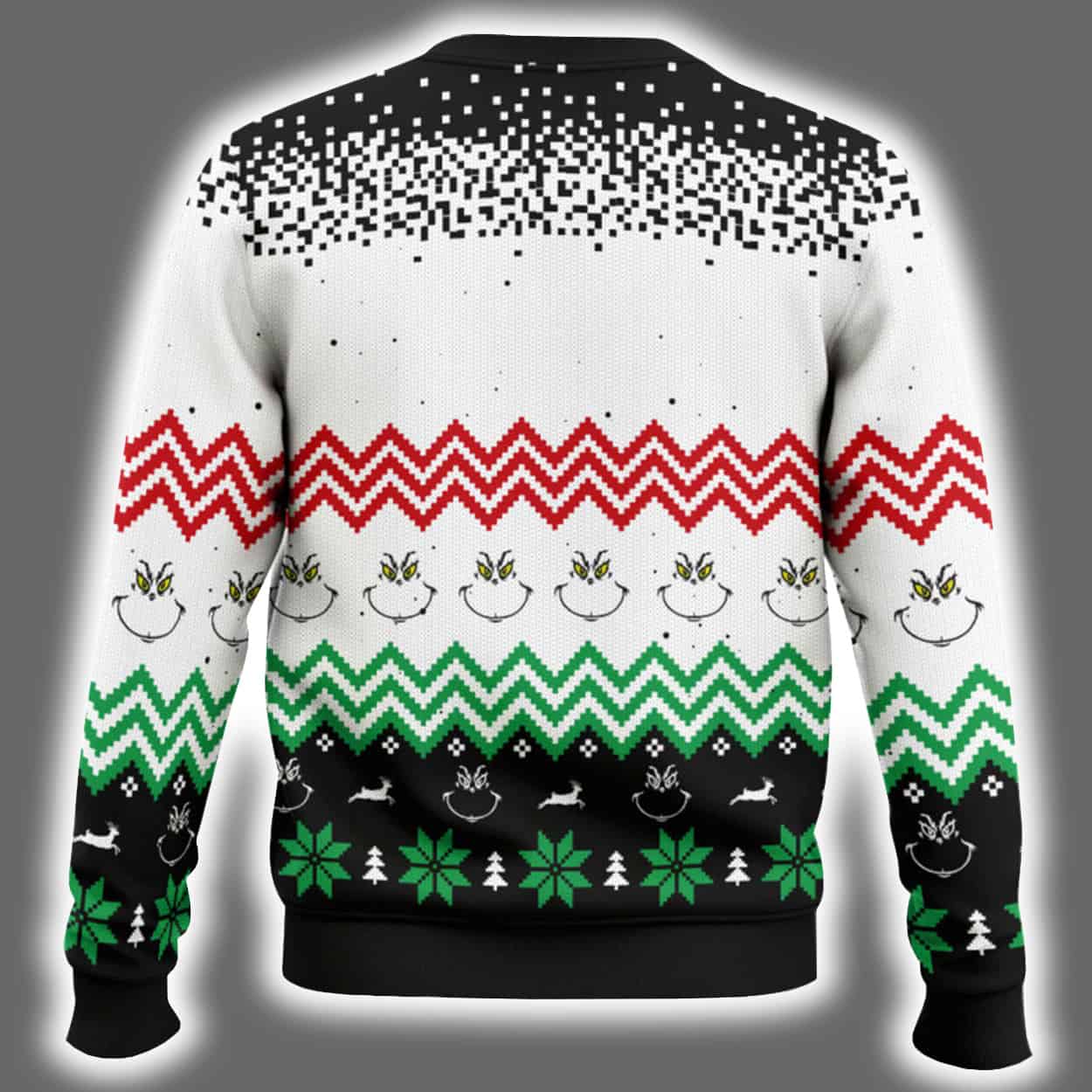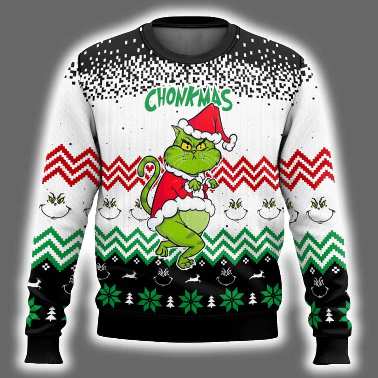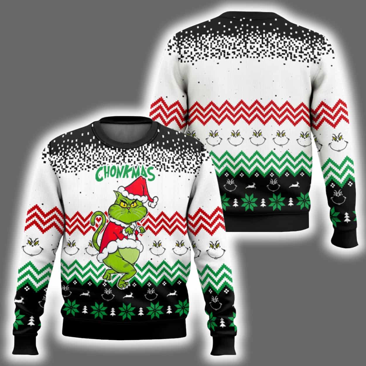 This sweater is a riot of holiday color and unapologetic attitude. Front and center is a delightfully chunky Grinch-inspired cat, decked out in a Santa suit and clutching a candy cane like it’s plotting something deliciously devious. Above the feline icon, the word CHONKMAS bursts forth in bold green lettering, setting the tone for a season of oversized joy. The background features zigzag stripes in red, green, white, and black, sprinkled with snowflakes, ornaments, and festive icons. The back continues the vibrant pattern, keeping the holiday spirit alive from every angle—even when you’re walking away with the last cookie.