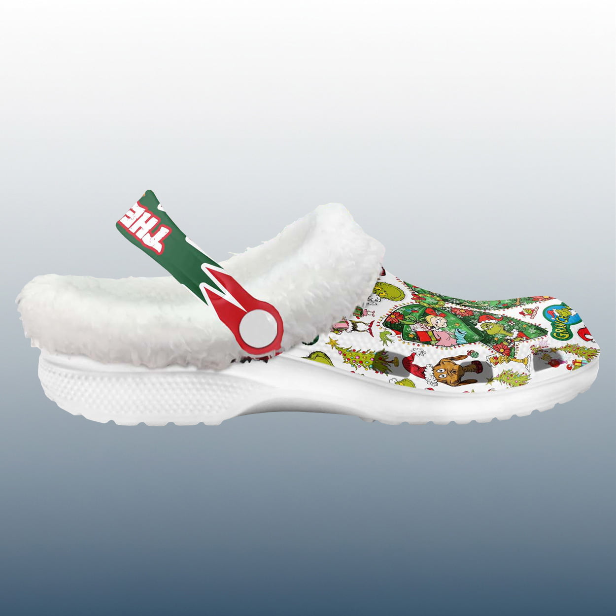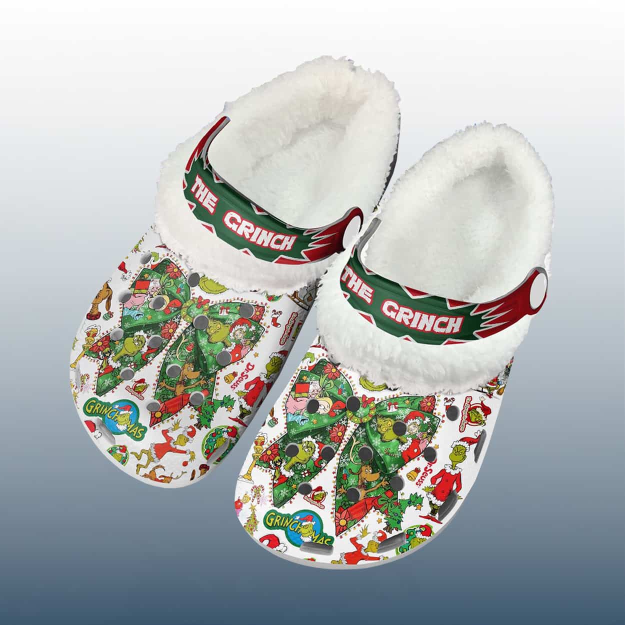 Celebrate the season with a twist of playful rebellion in this crocs. These festive clogs feature a snowy white base splashed with vibrant illustrations straight from Whoville—think cheeky Grinch grins, whimsical trees, and holiday chaos. The standout red-and-green strap boldly declares “THE GRINCH” in crisp white lettering, while the plush inner lining adds a layer of snug comfort perfect for chilly nights or cozy lounging. Whether you’re decking the halls or dodging carolers, these Crocs are your go-to for holiday flair with a wink.