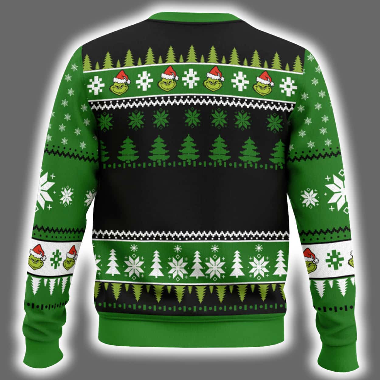 Step aside, Santa—there’s a new holiday icon in town. This sweater is a riot of festive fun, featuring a comic-style panel of the Grinch in various mischievous poses. Beneath the artwork, bold lettering spells out “GRINCHMAS” with “THEM’S TOUR” in red, giving this sweater the vibe of a concert tee for the most chaotic holiday headliner. Surrounding the central design are rows of Christmas trees, snowflakes, and cheeky Grinch faces that wrap around the sleeves and back, making this sweater a full-on celebration of seasonal snark.