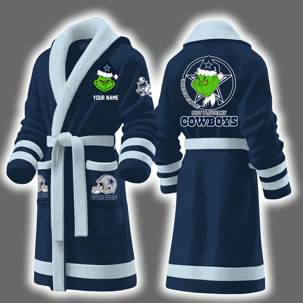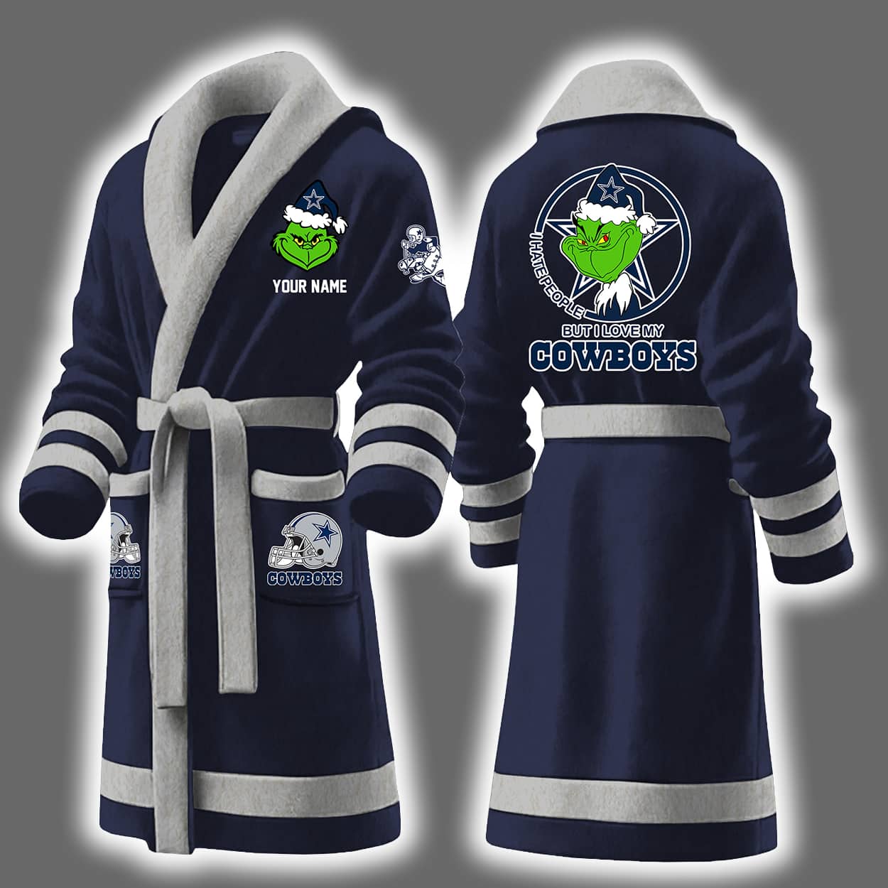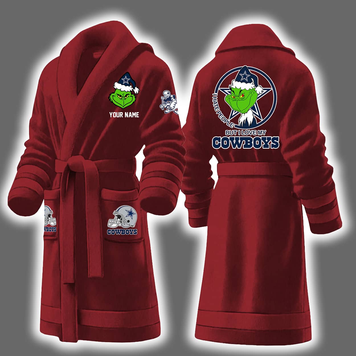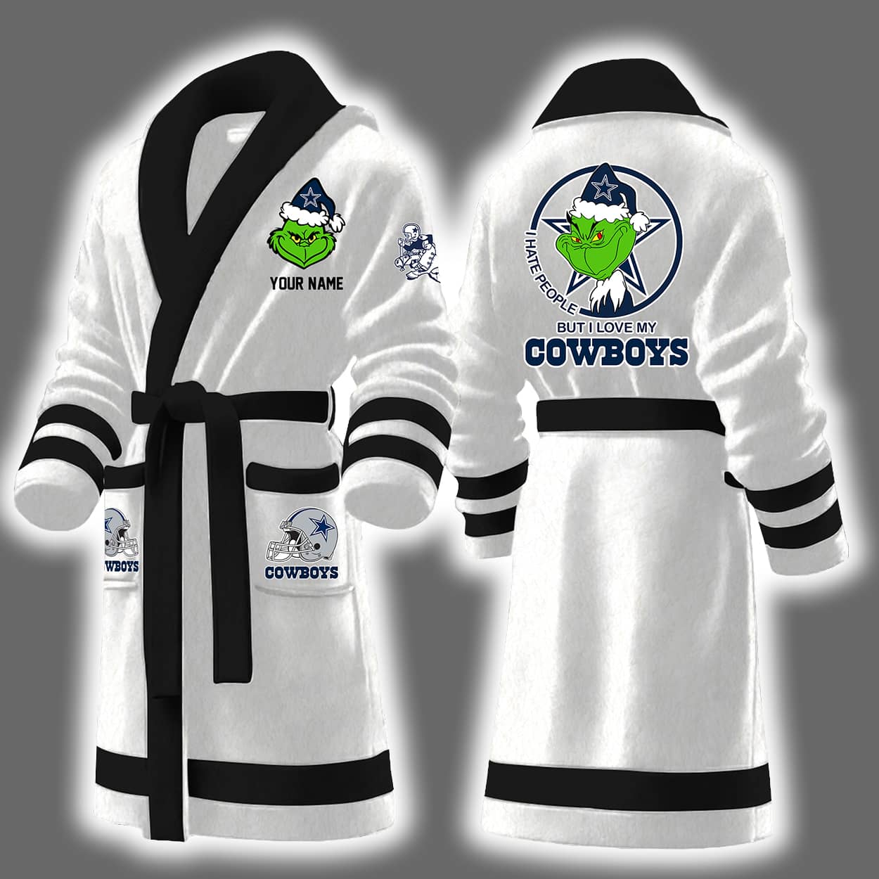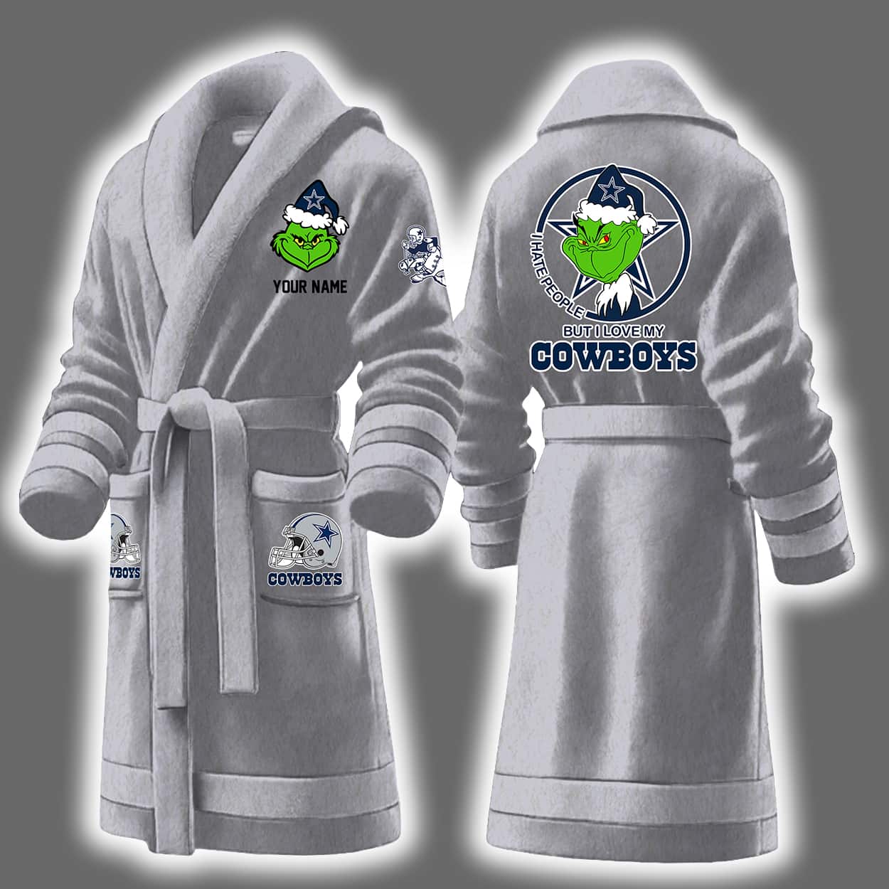 Ready to rep your Cowboys with a side of sass? Snag your Grnch I Hate People But I Love My Cowboys Bathrobe now and let the world know: you may hate people, but you love your team.