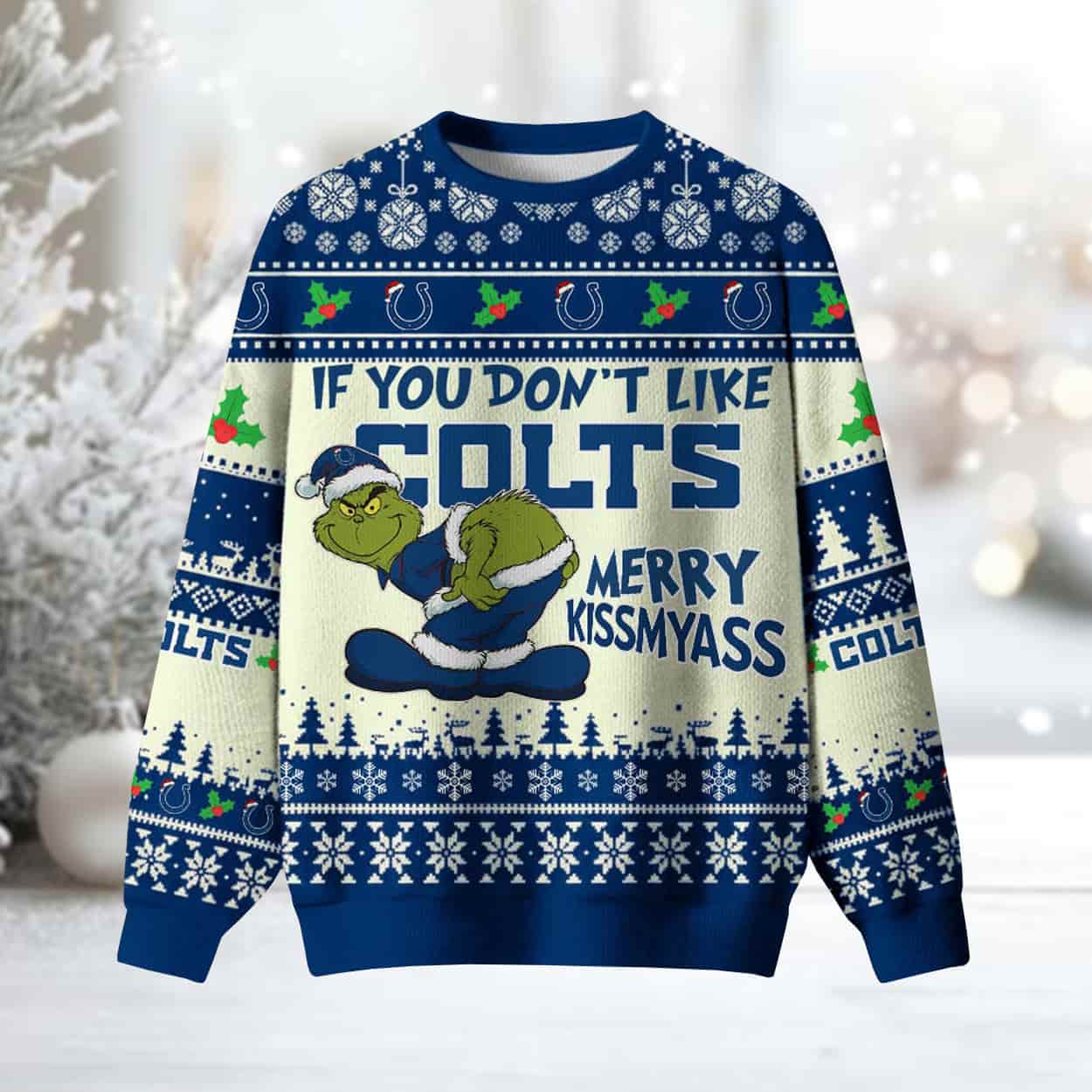 Deck the halls with attitude and team pride! This outrageous holiday sweater features the iconic Grinch dressed in a Santa suit, striking a mischievous pose that screams “I’m here to stir the eggnog.” Surrounding him is a cheeky message: “IF YOU DON’T LIKE COLTS, MERRY KISSMYASS”—a festive mic drop for any non-Colts fan. Snowflakes, holly, reindeer, and the unmistakable Colts horseshoe logo complete the design, blending classic Christmas charm with unapologetic sports loyalty.