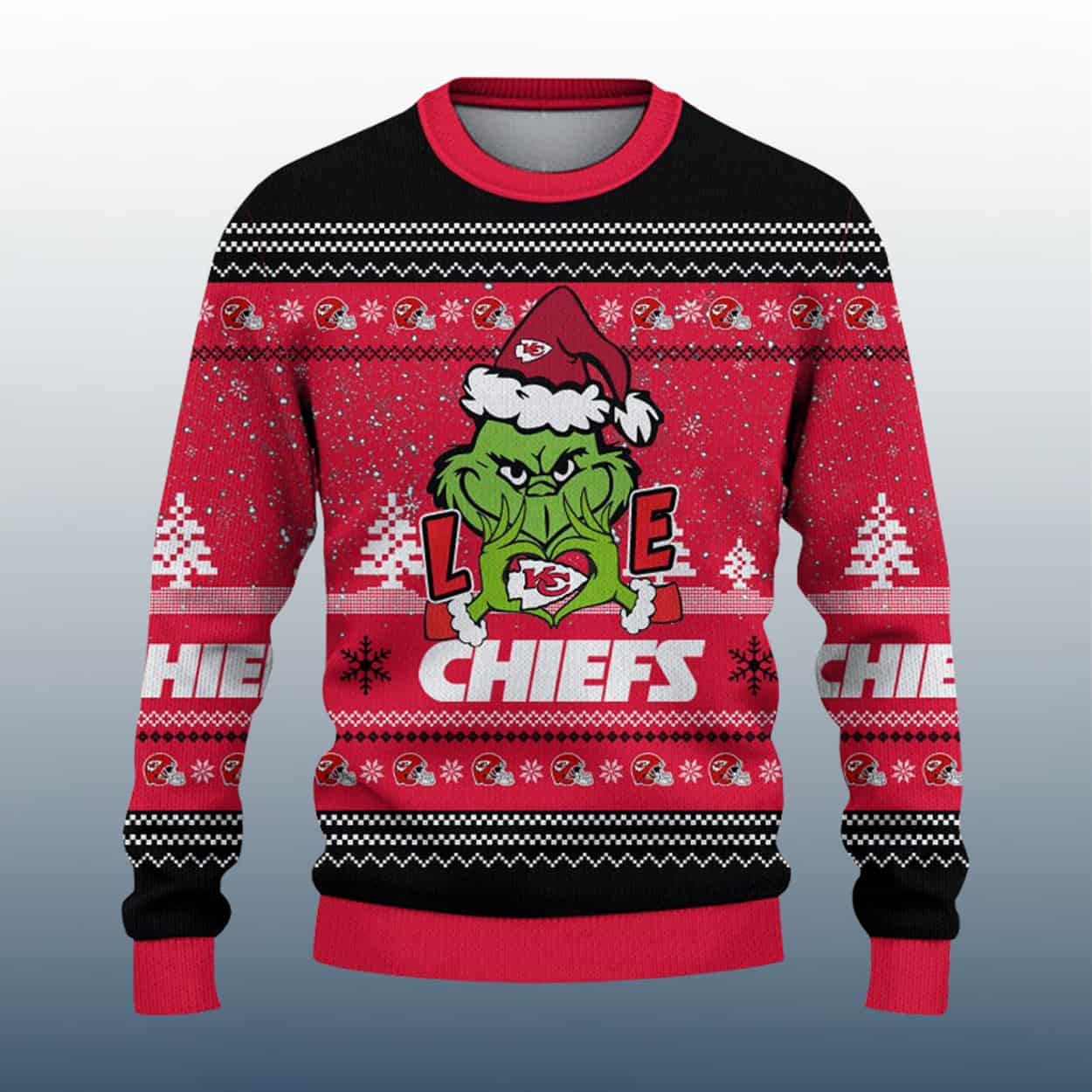 Turn heads and spark smiles this holiday season with this sweater! Drenched in bold red with black and white accents, this sweater is a festive explosion of snowflakes, Christmas trees, and team pride. Front and center, the Grinch grins mischievously in a Santa hat adorned with the Chiefs logo. He’s flanked by the letters “L” and “E,” with the Chiefs arrowhead logo cleverly forming the “O” to spell out “LOVE.” Beneath this cheeky display, “CHIEFS” is printed loud and proud. On the back, the iconic arrowhead logo and “CHIEFS” repeat across the midsection, surrounded by the same joyful holiday motifs.