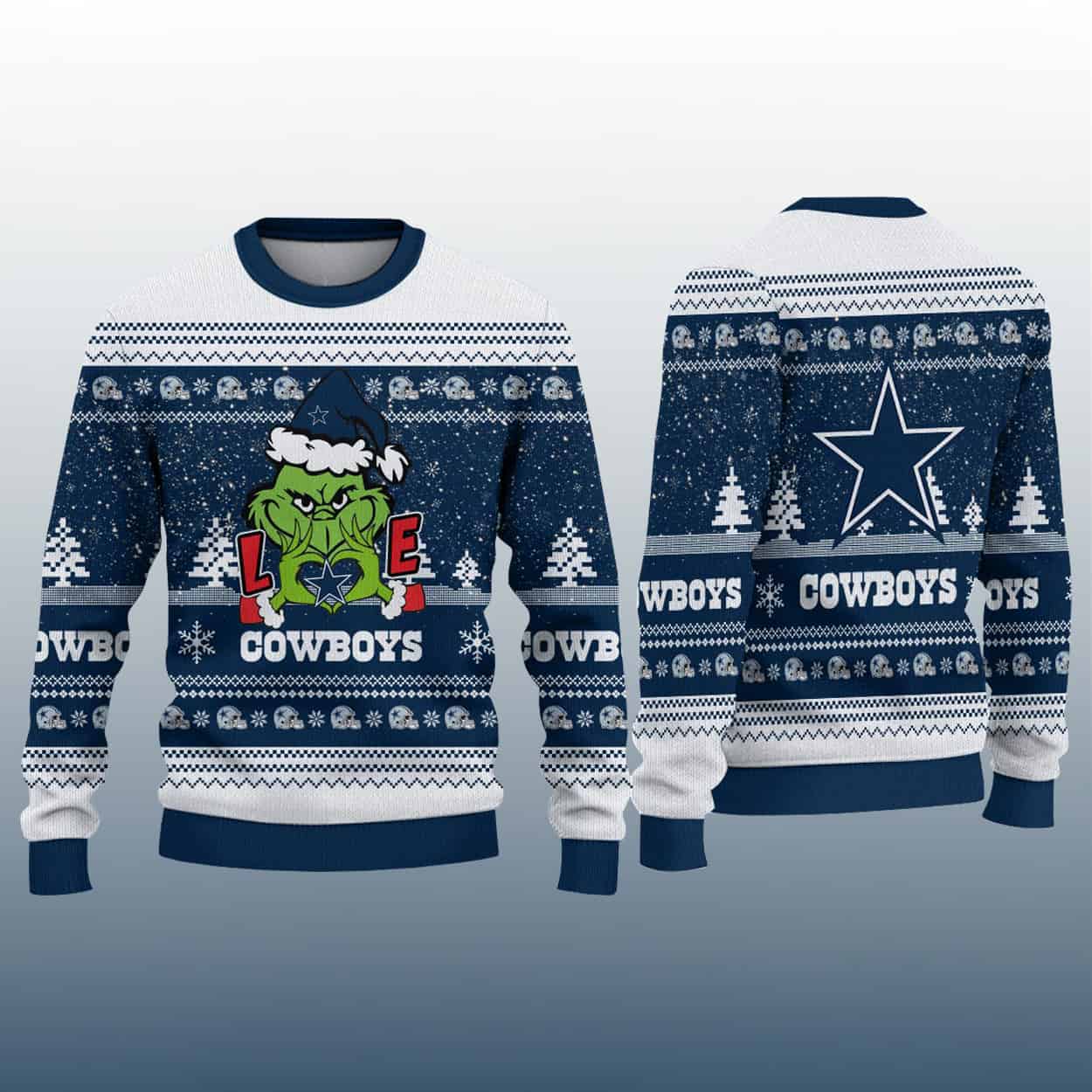 Celebrate the holidays with a mischievous twist and star-studded spirit in the Grnch Love Cowboys Ugly Christmas Sweater—perfect for fans who love festive flair and Dallas pride.