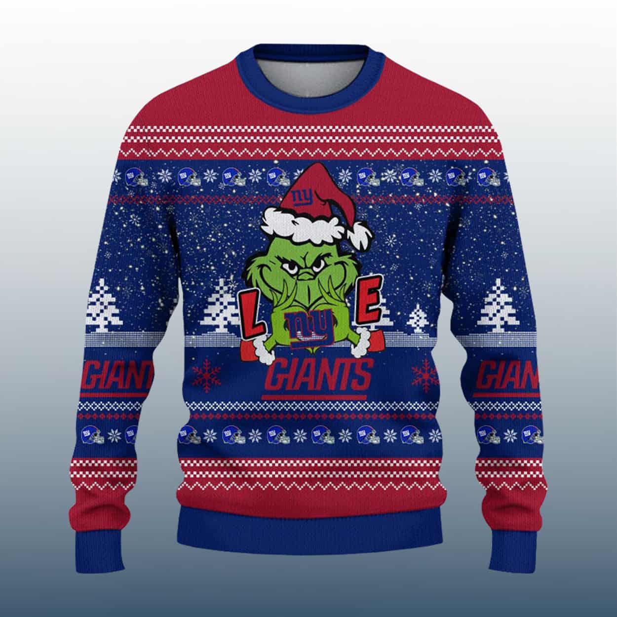 Add a dash of holiday mischief to your game-day wardrobe with this sweater! Bursting with bold red, blue, and white tones, this festive favorite features the Grinch rocking a Santa hat adorned with the Giants logo. He’s clutching a heart-shaped emblem that replaces the “O” in the word “LOVE,” which is spelled out playfully across the front. Snowflakes, Christmas trees, and zigzag patterns bring seasonal charm, while the word “GIANTS” stands proud beneath the design. On the back, the iconic “NY” logo takes center stage above a repeat of the team name—so your fandom shines from every angle.
