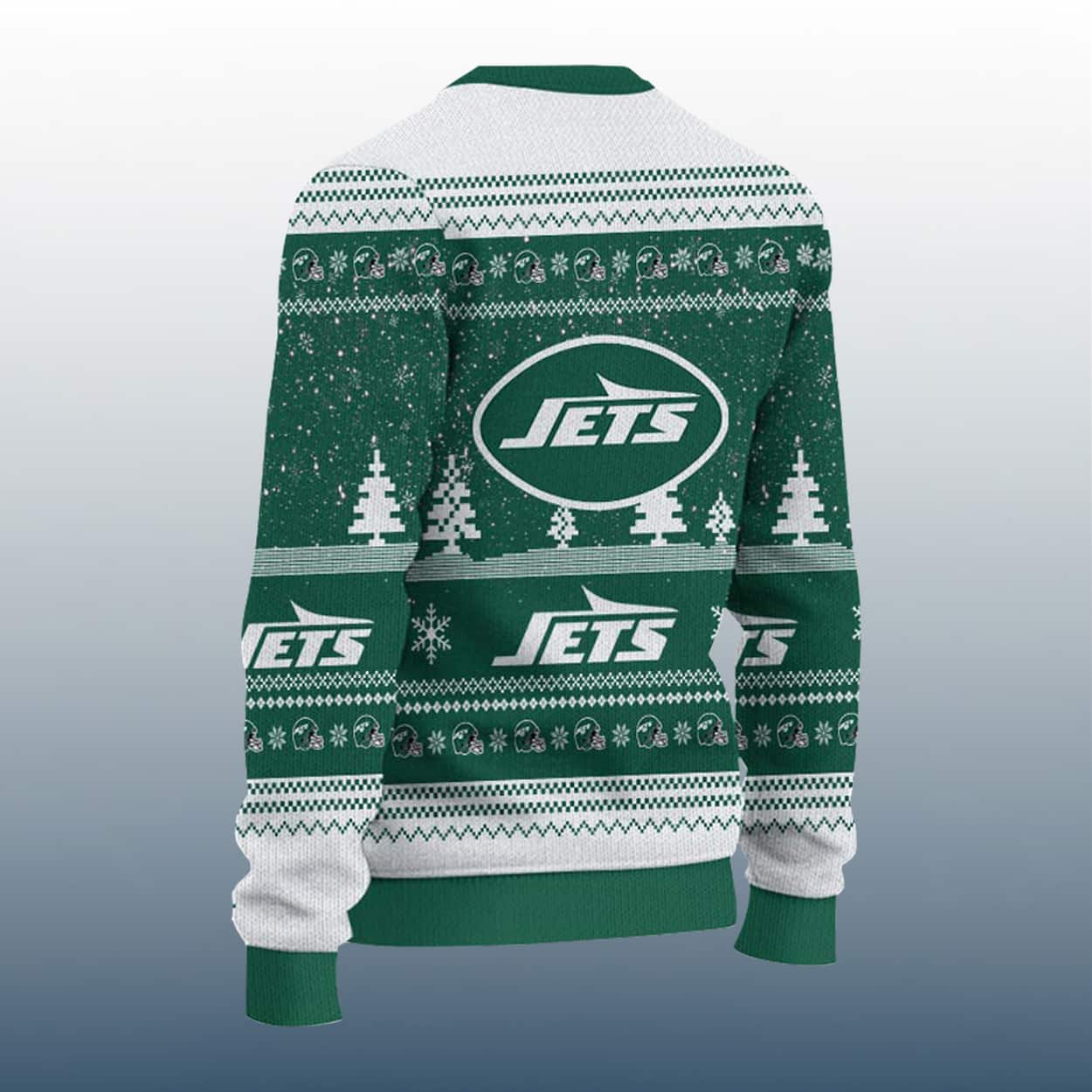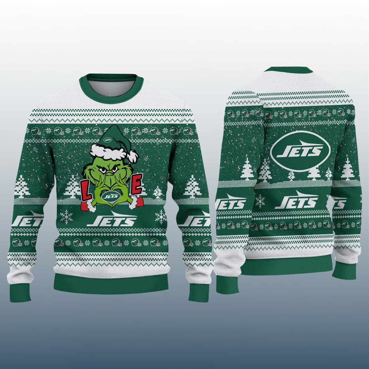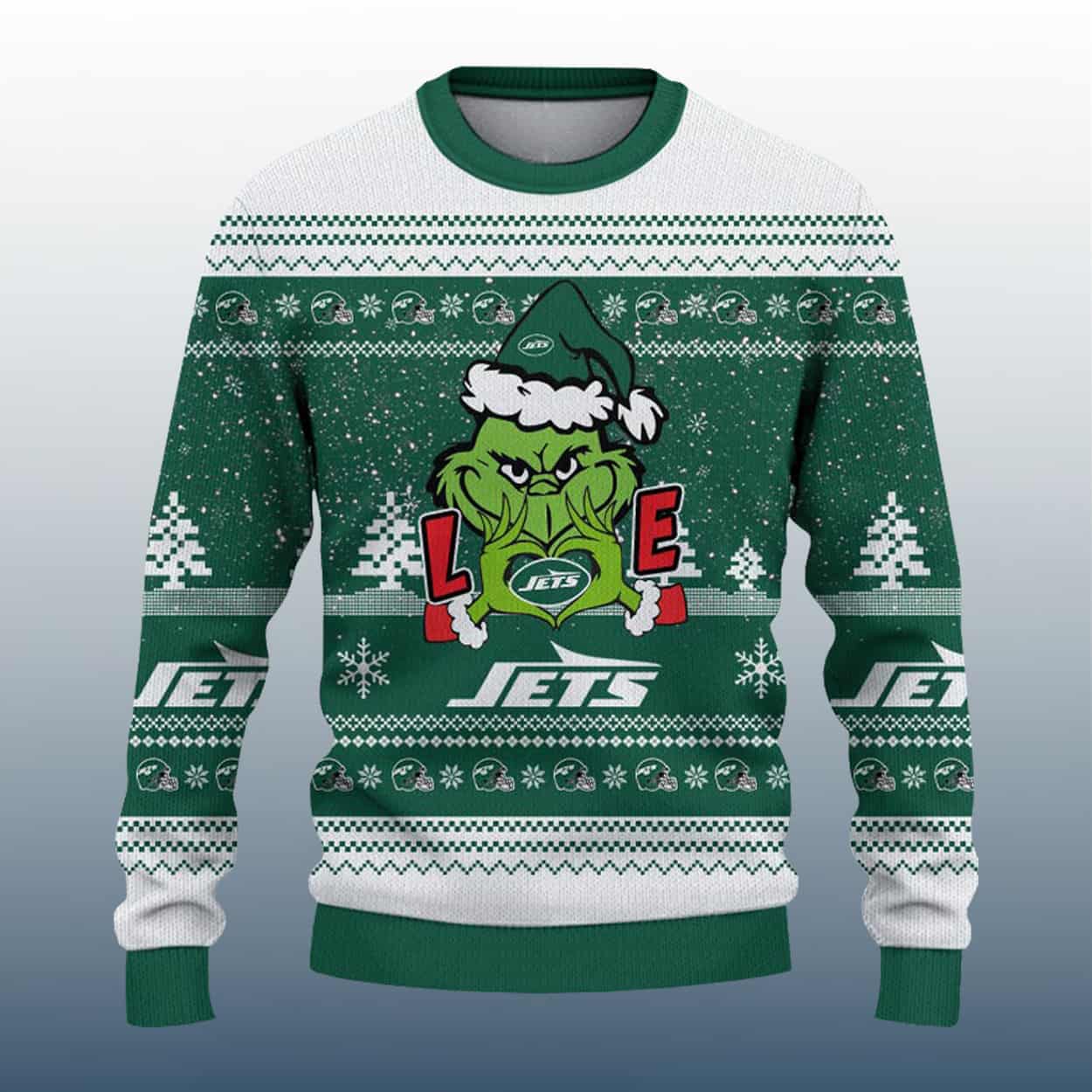 Turn heads this holiday season with this sweater—a bold blend of festive fun and Jets fandom. The front showcases a playful Grinch in a Santa hat, gripping the letters “L” and “E” with the Jets logo nestled between them to spell out “LOVE.” Below the graphic, “JETS” is printed loud and proud, surrounded by classic holiday motifs like snowflakes, Christmas trees, and geometric accents in a striking green and white palette. The sleeves and back continue the celebration with repeated “JETS” text and a large oval Jets logo, making sure your team spirit is visible from every angle.