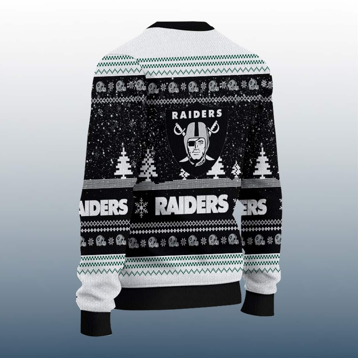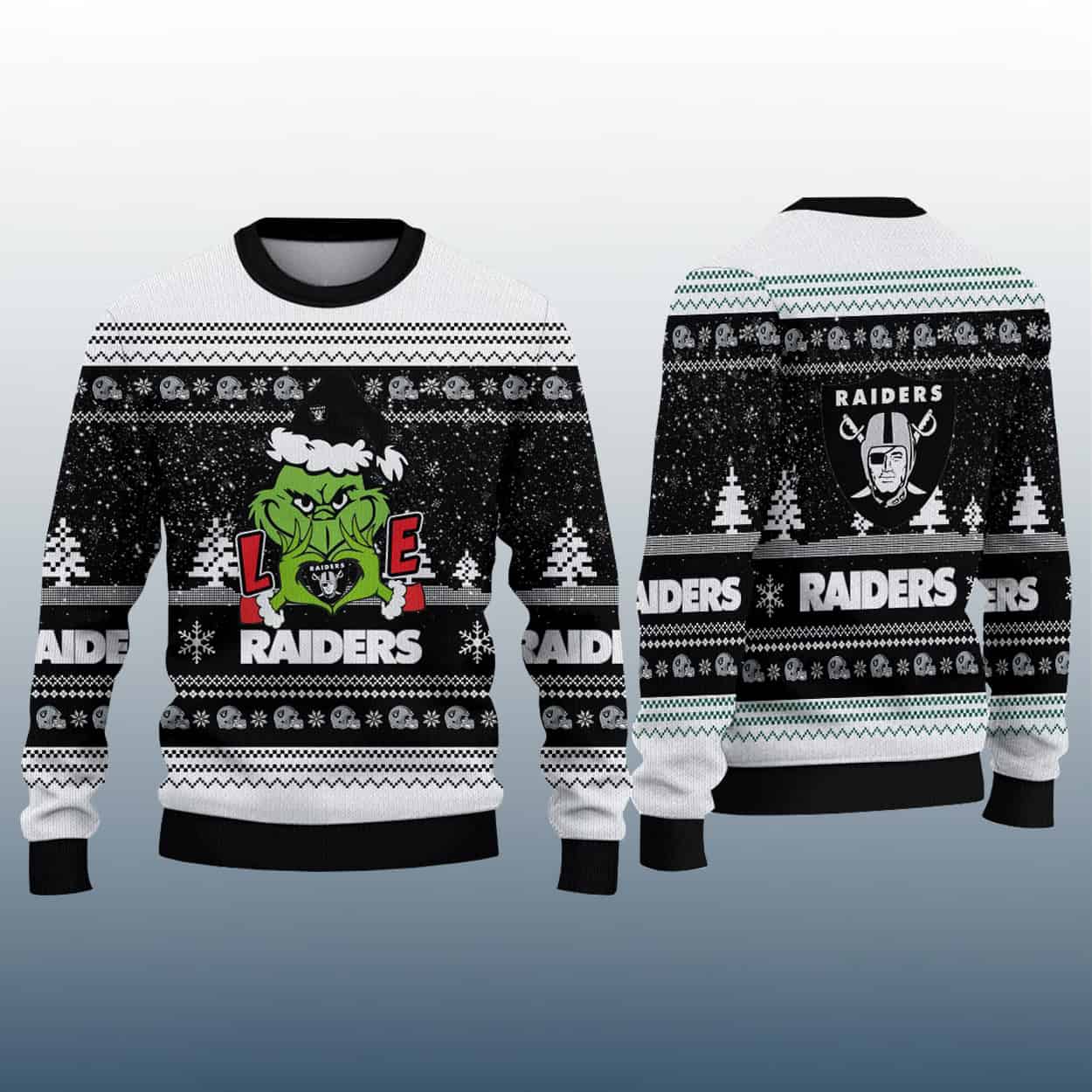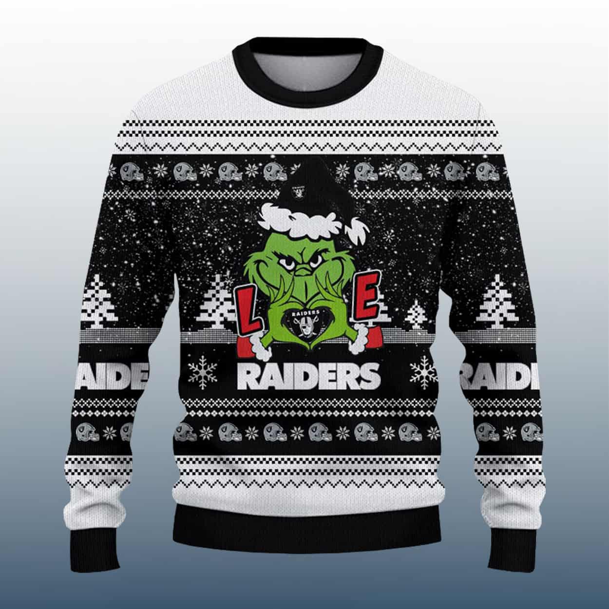 Celebrate the season with a rebellious twist in this sweater! This festive fan-favorite features a mischievous Grinch in a Santa hat, gripping the iconic Raiders logo to form the word “LOVE,” flanked by the letters “L” and “E.” Beneath the graphic, “RAIDERS” stands out in bold white, surrounded by classic holiday motifs—snowflakes, Christmas trees, and geometric accents—all rendered in a sleek black, white, and gray palette. The back keeps the energy fierce with a large Raiders logo and repeated “RAIDERS” text, making sure your allegiance is unmistakable from every angle.