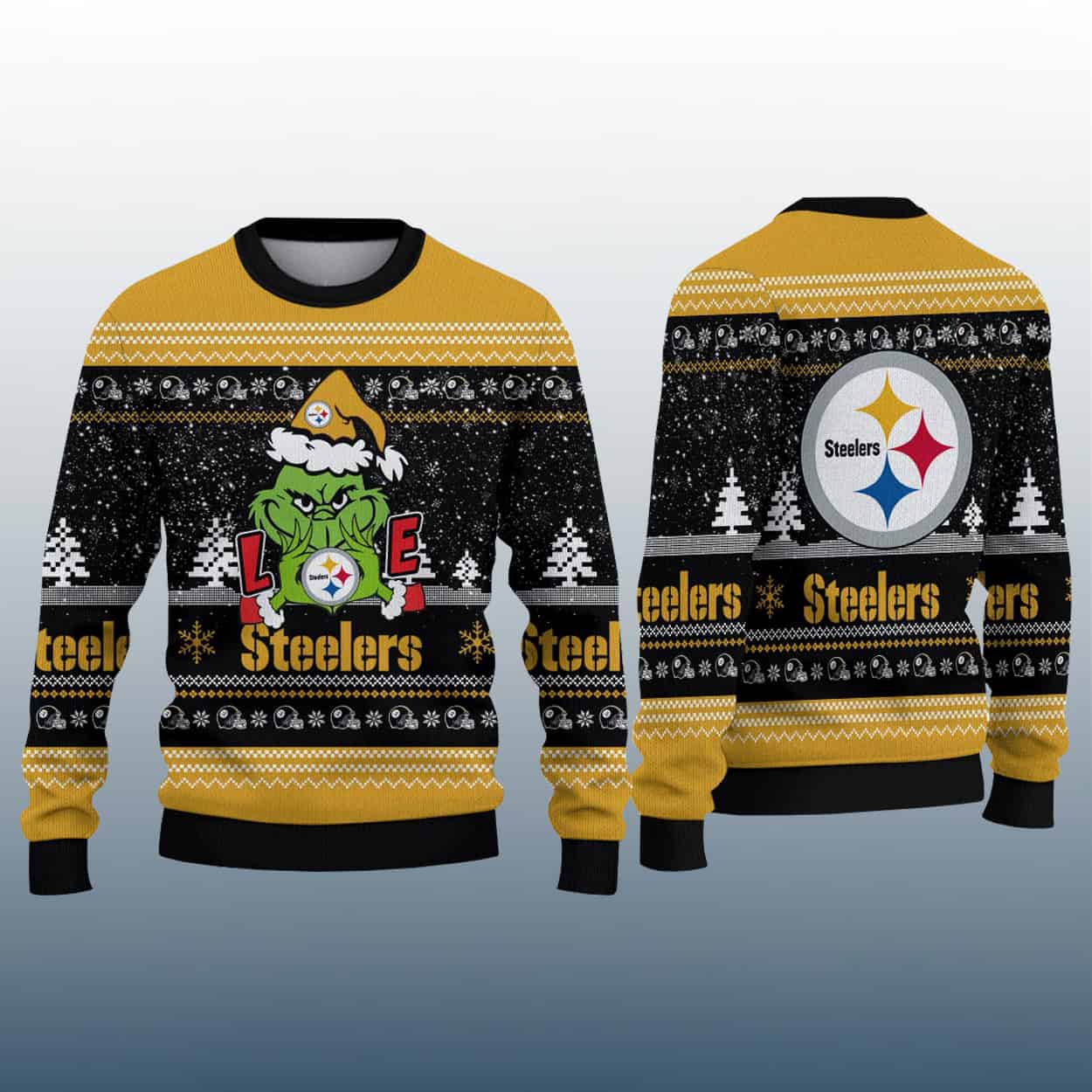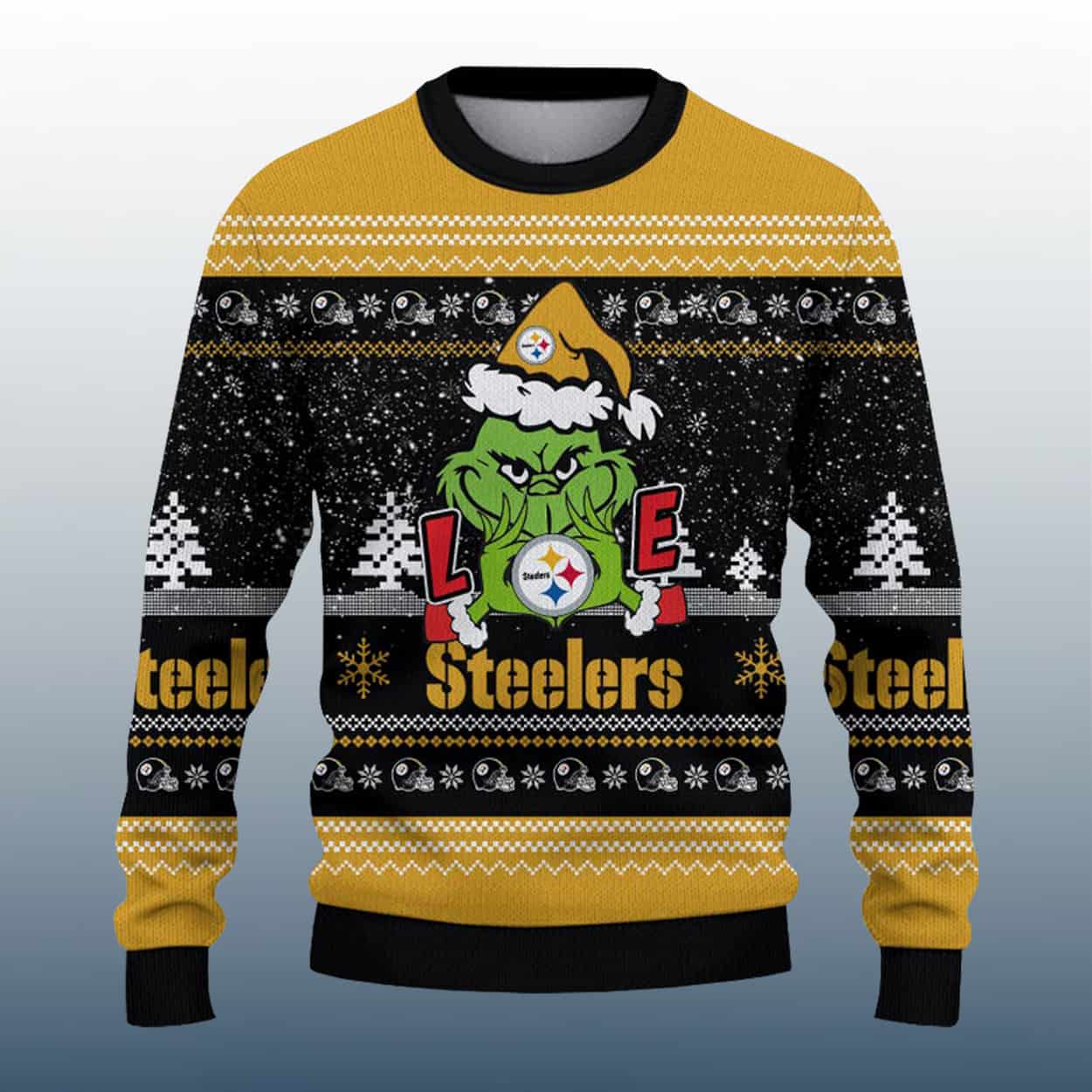 Get ready to blitz the holidays with a sweater that’s as cheeky as it is spirited! This sweater brings together festive fun and fierce fandom in a bold black, white, and gold palette. Front and center, the Grinch sports a Santa hat stamped with the Steelers logo, clutching a golden emblem that replaces the “O” in the word “LOVE.” Snowflakes, Christmas trees, and classic knit patterns add seasonal charm, while “Steelers” stands proudly beneath the design. On the back, the iconic Steelers logo dominates the upper section, with the team name repeated across the midsection—ensuring your loyalty is loud and clear from every angle.
