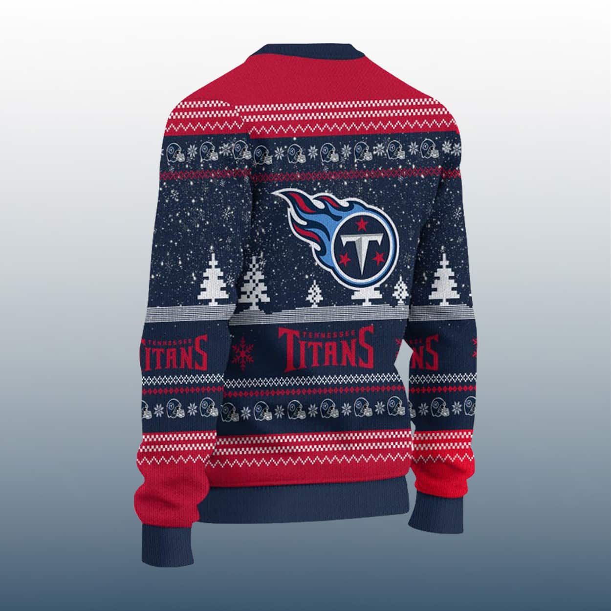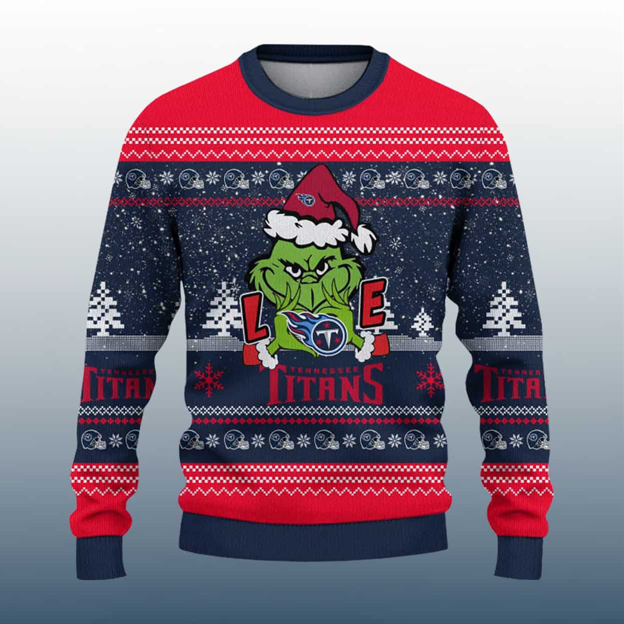 Get ready to tackle the holidays in style with this sweater—a festive fusion of Titans fandom and playful holiday mischief. This eye-catching sweater features a bold red, navy blue, and white color scheme, decked out with snowflakes, Christmas trees, and decorative borders. Front and center, the Grinch smirks in a Santa hat while holding the Titans logo, which cleverly replaces the “O” in the word “LOVE.” Flanked by the letters “L” and “E,” and anchored by the word “Titans,” the design spells out your passion with cheeky charm. The back keeps the momentum going with the flaming thumbtack Titans logo and matching team text, surrounded by seasonal flair that wraps your fandom in holiday joy.
