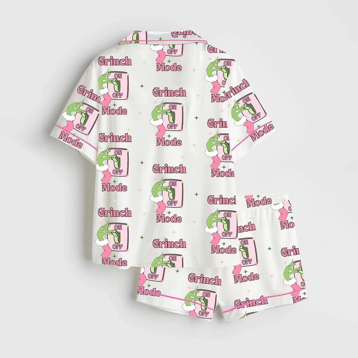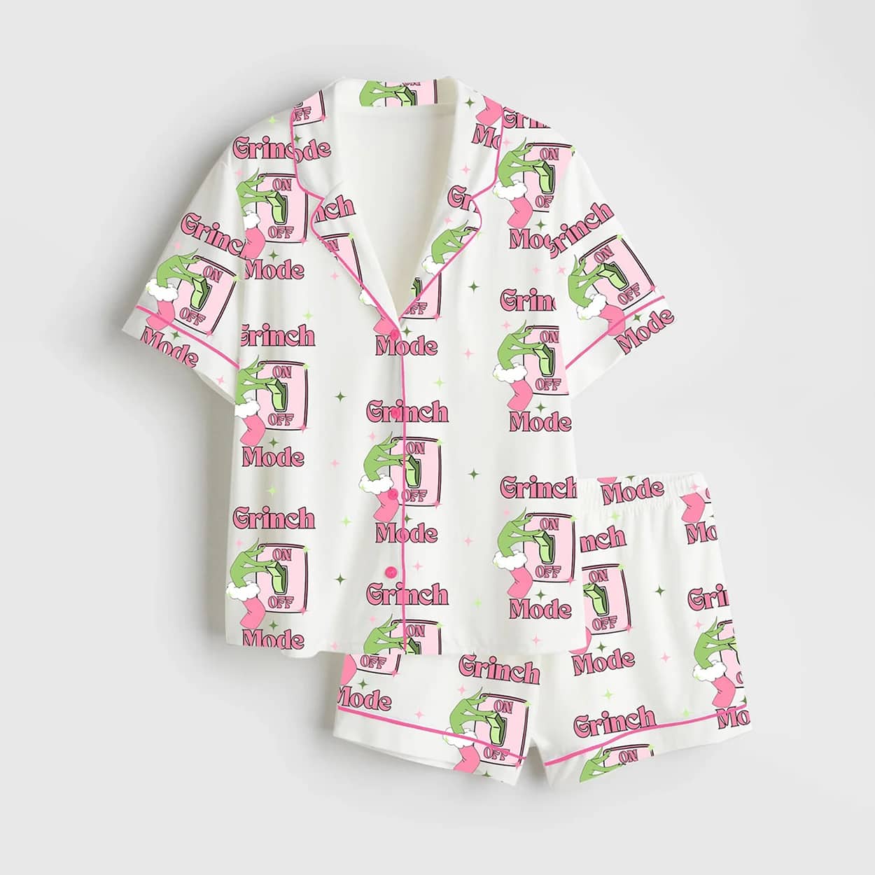 This pajama set is a holiday mood in wearable form. Featuring a short-sleeved button-up shirt and matching shorts, the design pops with a white base and a vibrant print of the iconic Grinch in green and pink. Scattered across the fabric are playful poses of the Grinch alongside bold, whimsical text that reads “Grinch Mode,” repeated in various sizes and orientations. It’s a cheeky nod to those who prefer sarcasm over sugar cookies and side-eyes over sleigh rides. Whether you’re lounging by the fire or dodging carolers, this set keeps you comfy and unapologetically festive.