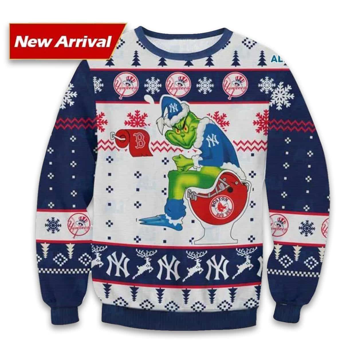 This outrageously festive garment is a definitive statement piece for the passionate New York Yankees enthusiast. The sweater’s construction includes a cozy, quality knit base adorned with a bold, full-chest graphic. The illustration features a Grinch-styled figure in Yankees colors and cap, comically seated on a toilet emblazoned with the Boston Red Sox logo. The pattern is further embellished with classic Yankees pinstripes, logos, holiday snowflakes, and baseball icons, ensuring a visually striking and humorous appearance at any event.
