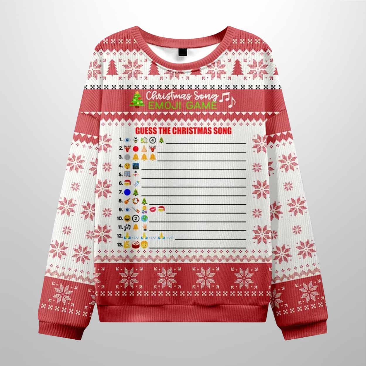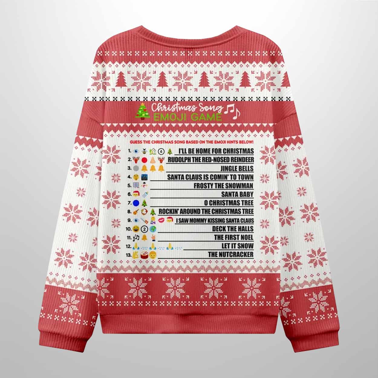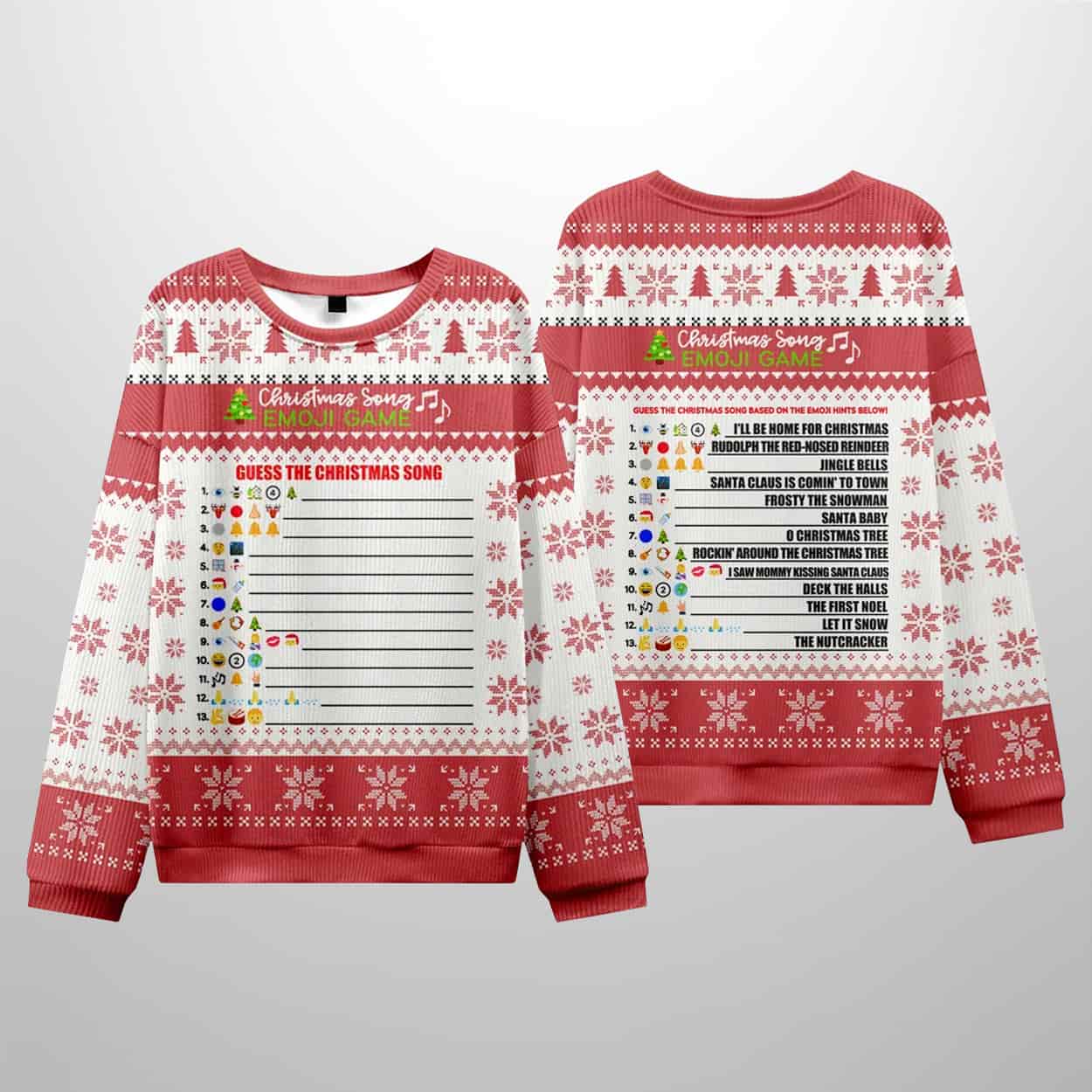 Get ready to be the life of the party with this sweater! This festive favorite features a vibrant red, white, and pink design adorned with snowflakes, Christmas trees, and cozy little houses. But the real magic lies in its interactive twist: the front showcases a playful list of emoji sequences, each cleverly representing a classic Christmas song. Flip to the back and you’ll find the answers—like 🎅🏻➡️🏠 for “Santa Claus is Coming to Town” and 👼👂 for “Do You Hear What I Hear?” It’s a wearable game that turns every gathering into a guessing challenge.