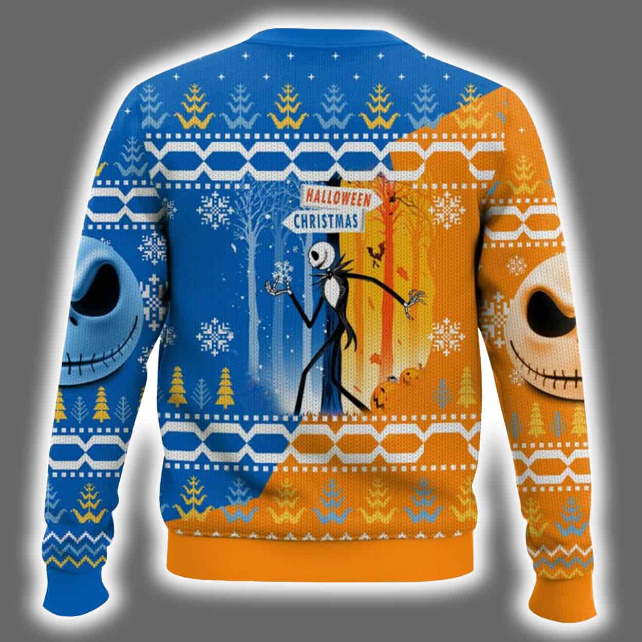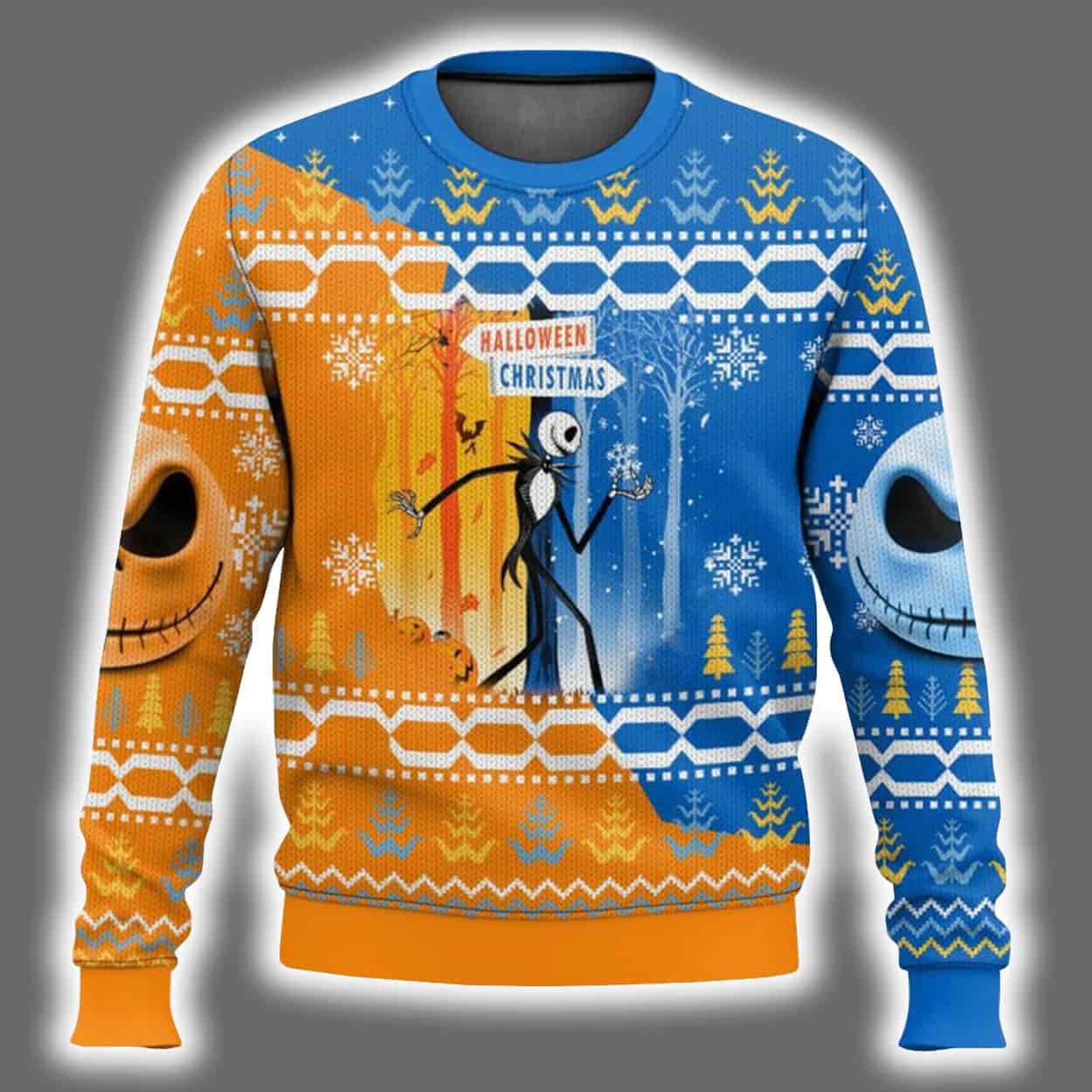 Why choose between tricks or treats and tinsel when you can have both? This eye-catching sweater features a split-color design—fiery orange on one side, icy blue on the other—symbolizing the collision of Halloween and Christmas. At the center stands Jack Skellington, the Pumpkin King himself, surrounded by snowflakes and stylized Christmas trees. Above him, the phrase “HALLOWEEN CHRISTMAS” boldly declares this sweater’s dual allegiance. The sleeves showcase Jack’s iconic grinning face, making sure your spooky spirit shines from every angle. The back continues the festive pattern, keeping the theme alive even when you turn around.