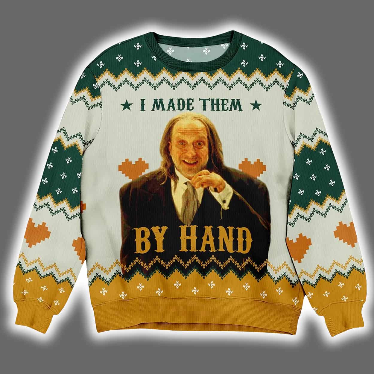 This sweater is a festive fever dream for fans of twisted humor and unforgettable movie quotes. Featuring a classic knit-style pattern in green, white, and mustard yellow, it’s adorned with hearts, zigzags, and a central image that steals the show: Hanson, the hilariously unsettling character from Scary Movie 2, clutching his prized dish with a proud grin. Above him, the sweater reads “I MADE THEM,” and below, “BY HAND”—a cheeky nod to one of the film’s most bizarre and quotable moments. Equal parts cringe and comedy, this sweater is guaranteed to get double takes and belly laughs at any holiday gathering.