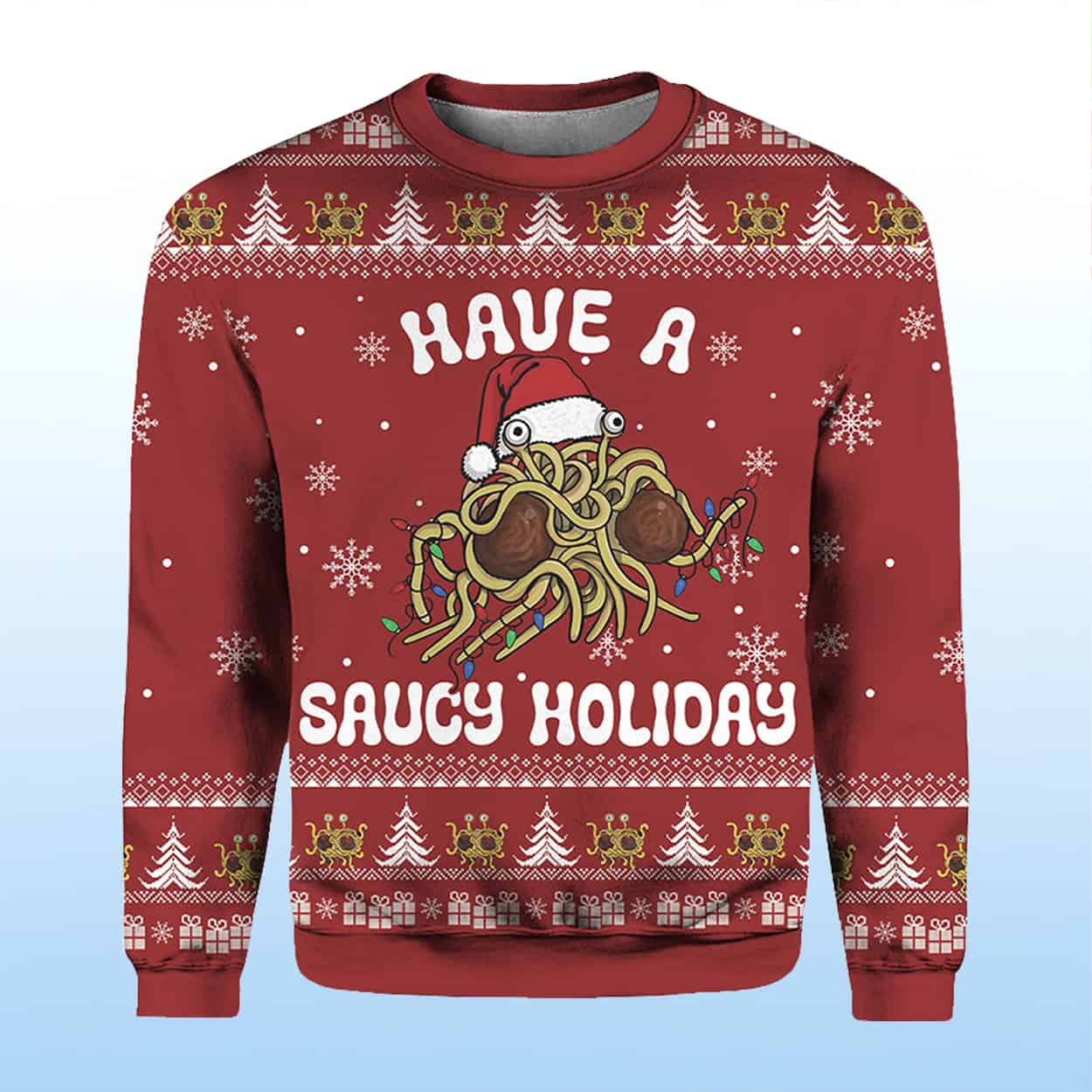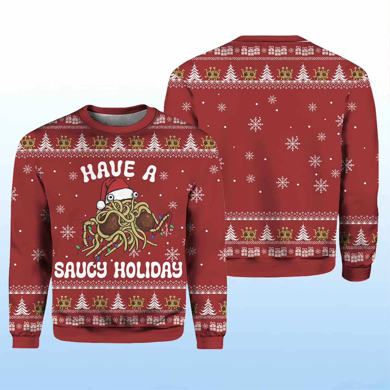 Serve up holiday laughs with the Have Saucy A Holiday Ugly Christmas Sweater—where pasta meets festive parody.