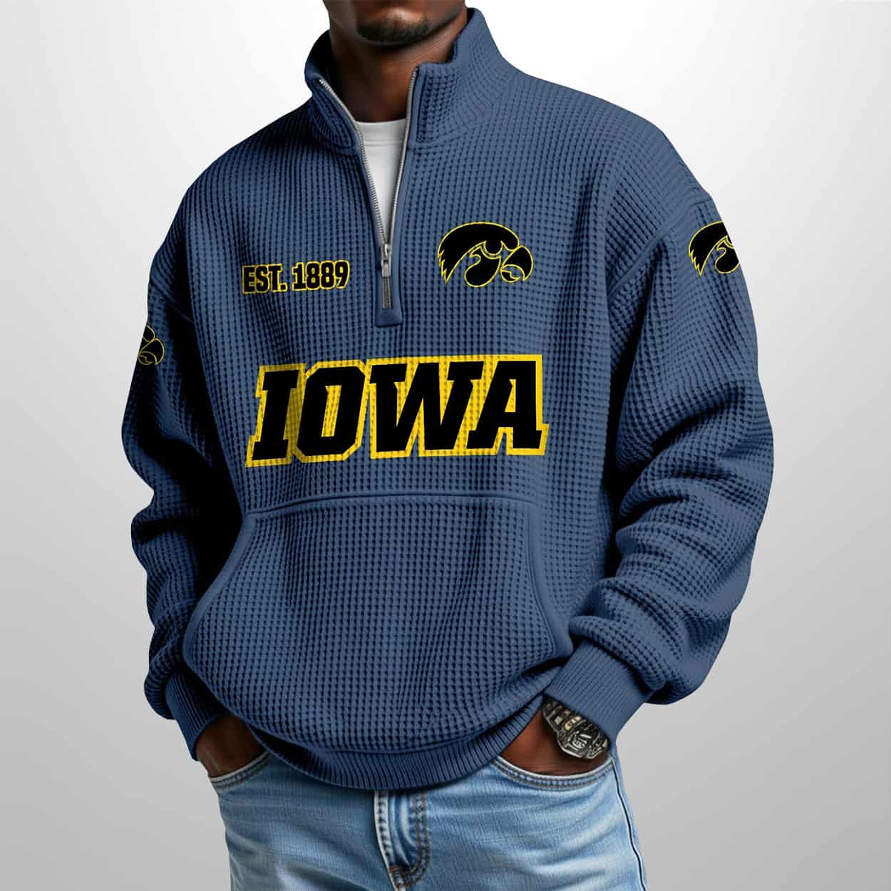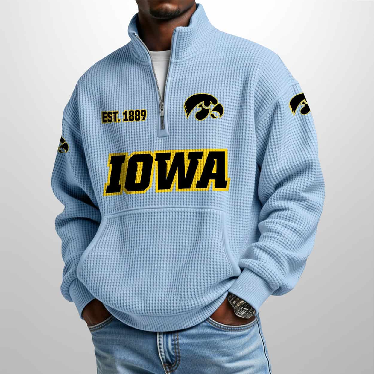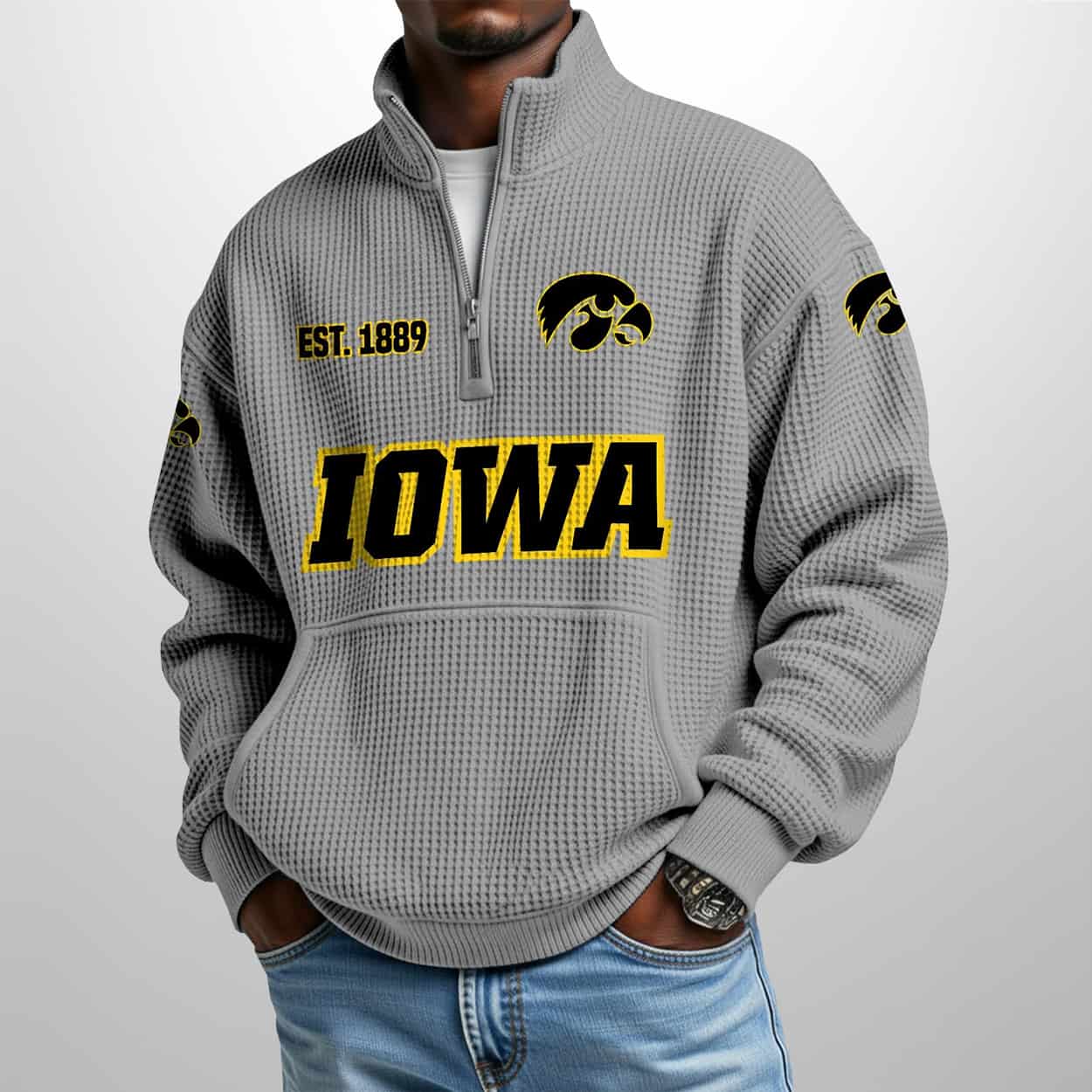 Show off your Hawkeye pride with the Hawkeyes Est 1889 Waffle Stand Collar Half Zip Sweatshirt—where bold design meets timeless grit.