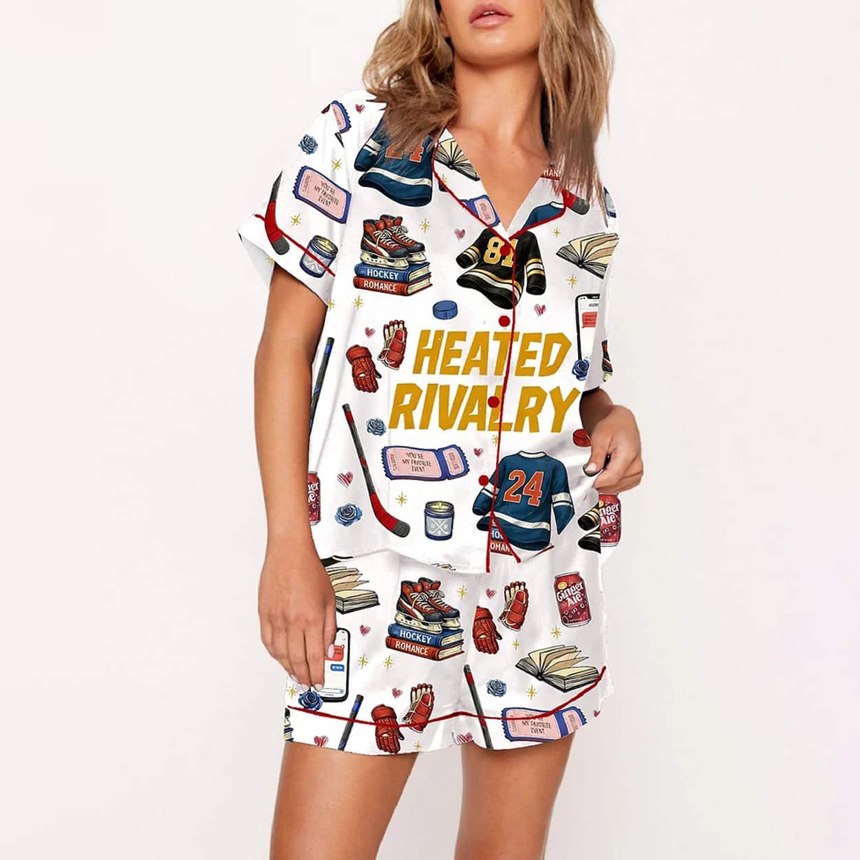 Get ready to lounge in style with this set—a cheeky, vibrant ensemble that’s as fun as your favorite rom-com and as intense as a playoff game. This matching short-sleeved button-up shirt and shorts combo features a white base splashed with colorful illustrations: hockey sticks, gloves, pucks, jerseys marked with the number “24,” mobile phones, books, and drinks. The bold yellow “HEATED RIVALRY” across the chest sets the tone—this isn’t just sleepwear, it’s a mood. Whether you’re binge-reading or trash-talking your fantasy league, this set brings the drama.