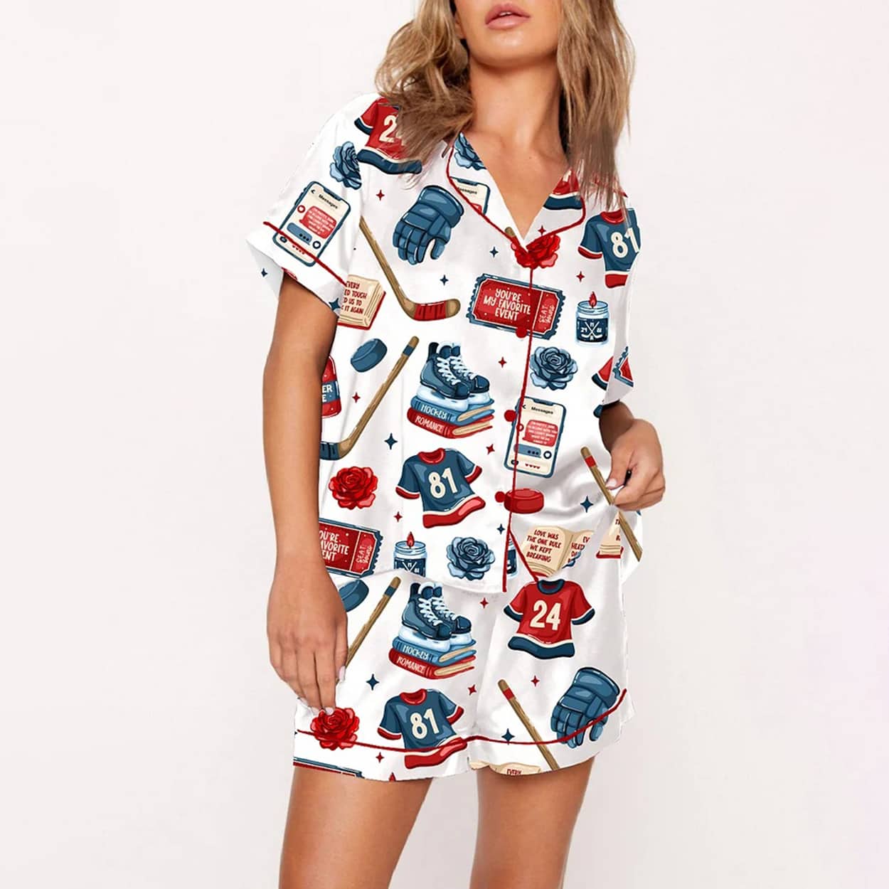 Get ready to dream in power plays and poetic flair with this set. This vibrant two-piece features a short-sleeved button-up shirt and matching shorts, decked out in a riot of hockey-themed illustrations. From skates and sticks to gloves and jerseys numbered “24” and “87,” every inch of this set screams rink-side energy. Scattered among the graphics are cheeky phrases like “Hockey is my favorite season” and “Eat Sleep Hockey Repeat,” making it a perfect pick for fans who live and breathe the game.