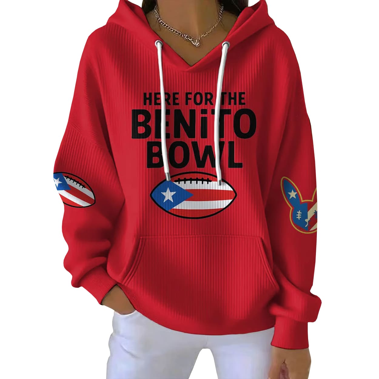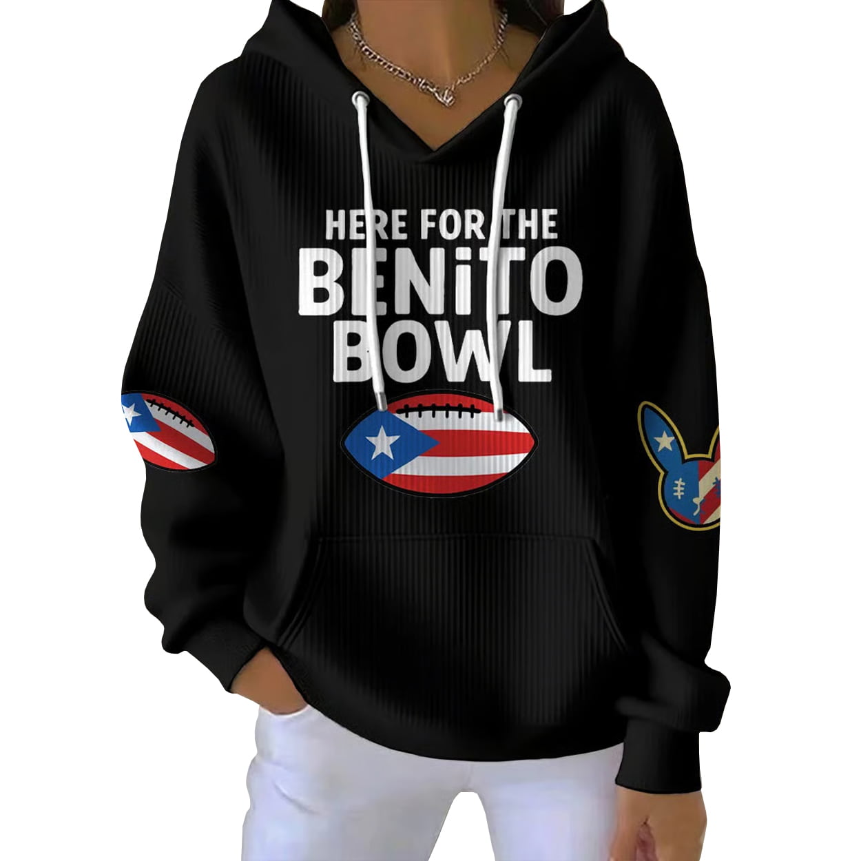 Step into the spotlight with this hoodie—a head-turning piece that blends streetwear flair with football fever. This white ribbed hoodie features bold black lettering across the chest that declares your allegiance: “HERE FOR THE BENITO BOWL.” Just below, a stylized football adorned with the Puerto Rican flag adds a punch of color and cultural pride. Matching graphics on the sleeves keep the energy flowing from every angle, while the clean white palette makes it a versatile standout.