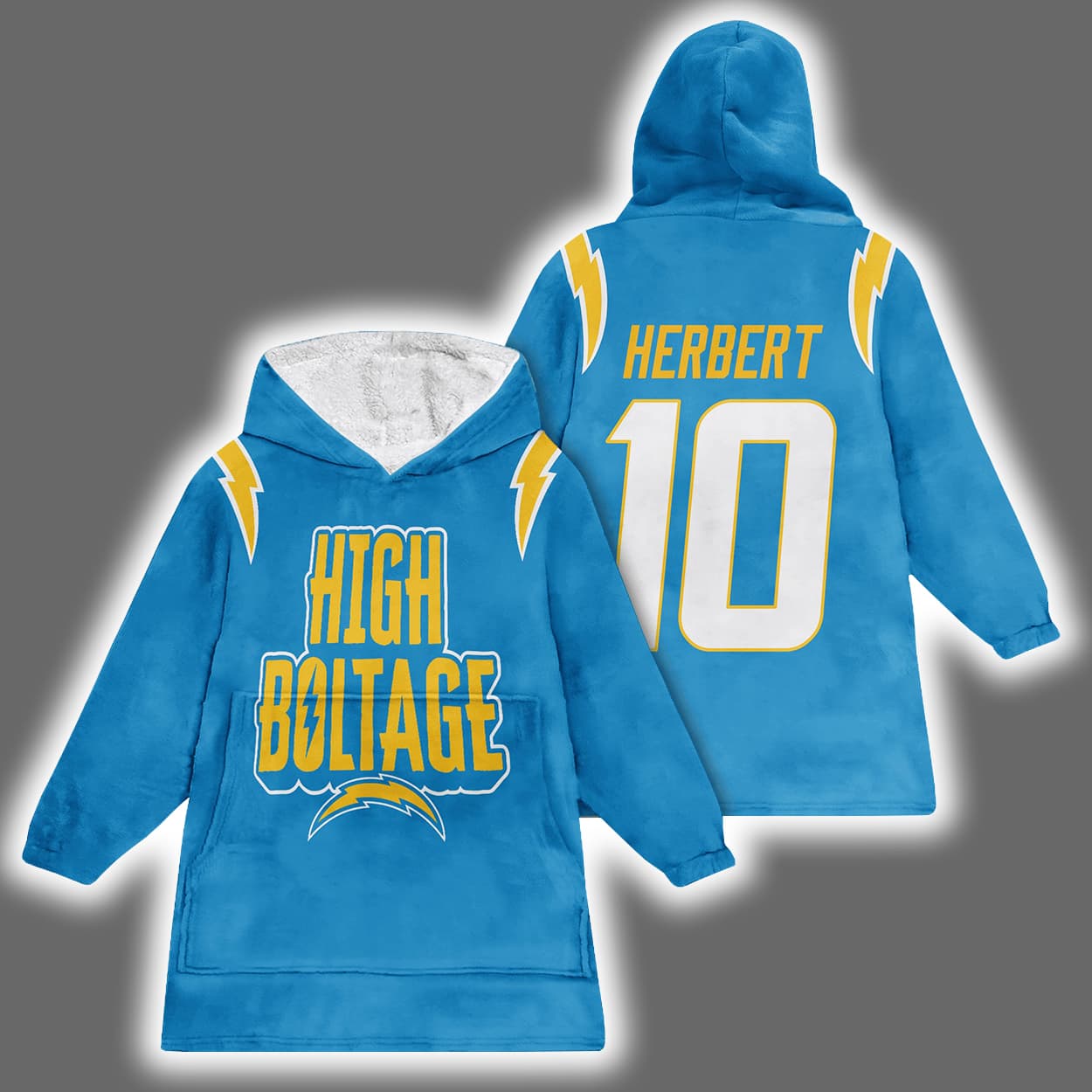 Plug into comfort and team pride with this hoodie. This hoodie is a lightning strike of style, featuring the phrase “HIGH BOLTAGE” in bold yellow letters across the chest, outlined in white for extra pop. Beneath it, a stylized lightning bolt logo amps up the energy. On the back, the name “HERBERT” blazes across the shoulders in matching yellow, while the number “10” stands tall in crisp white — a clear nod to the Chargers’ dynamic quarterback. The electric blue base color and clean layout make this a standout piece for fans who love to spark conversation.