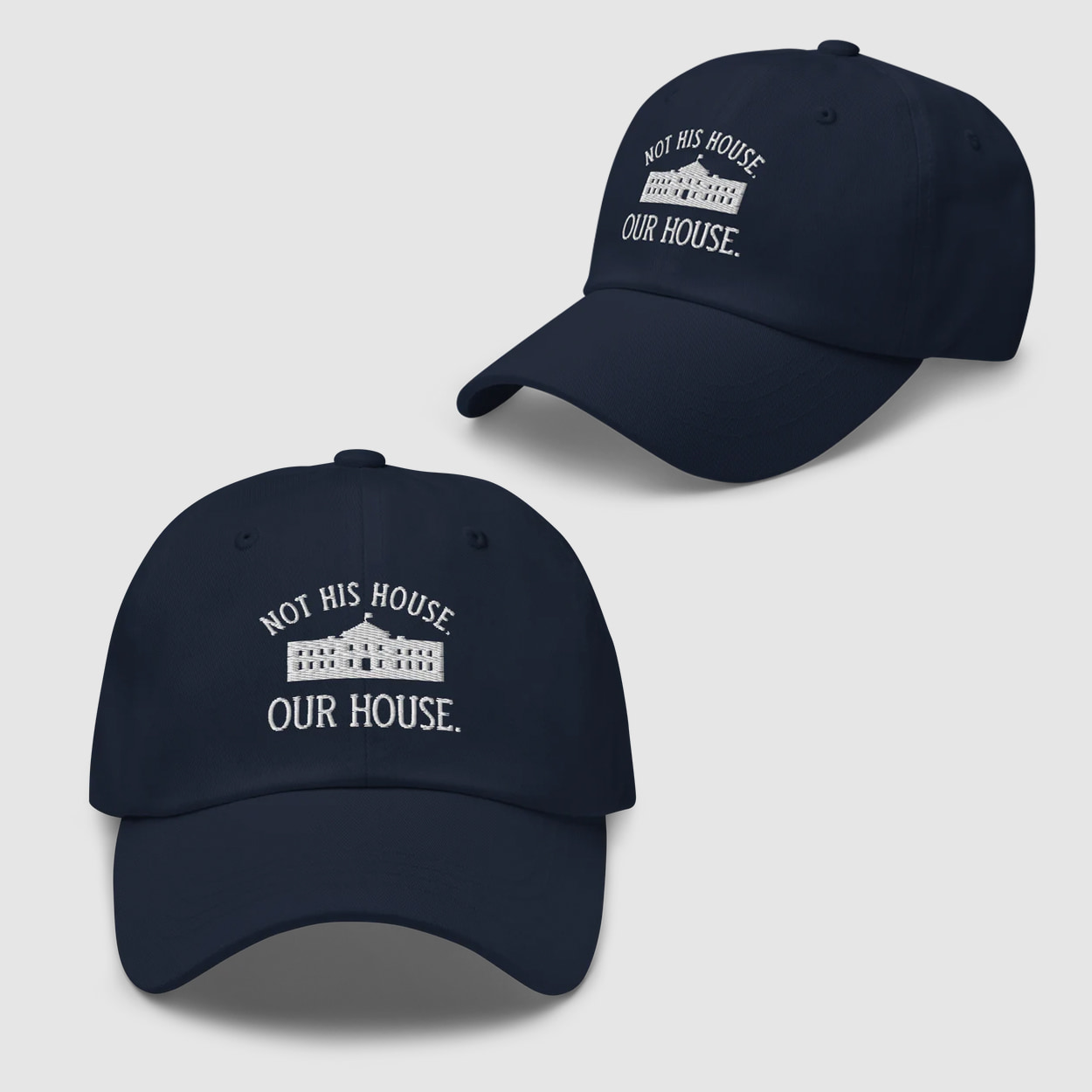 This cap isn’t just headwear—it’s a declaration. Embroidered on the front is a crisp white outline of the White House, flanked by the words “NOT HIS HOUSE” above and “OUR HOUSE.” below. The design is clean, striking, and unmistakably defiant. Whether you’re marching, mingling, or just making a statement at brunch, this hat turns heads and sparks conversations. It’s more than merch—it’s a movement stitched into every thread.
