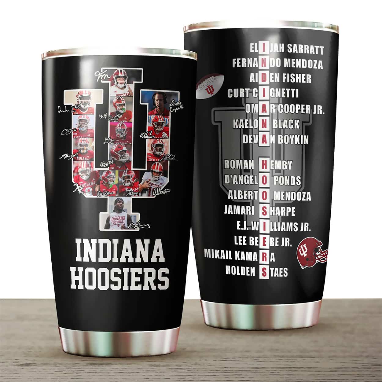 Whether you’re tailgating in Bloomington or powering through your morning hustle, this tumbler is your ultimate sidekick. One side bursts with energy—a dynamic collage of Indiana football players and coaches packed inside the bold “IU” logo, all anchored by the proud “INDIANA HOOSIERS” banner. Flip it around and you’ll find a roll call of greatness: fifteen standout names from the 2025-26 roster, each paired with a crisp red square that pops against the sleek black backdrop. It’s not just a tumbler—it’s a tribute.