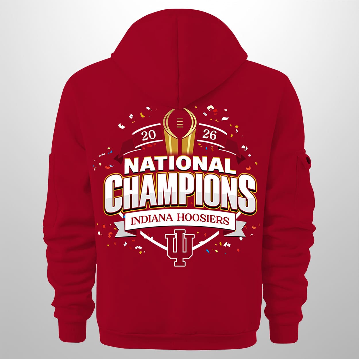 The impossible has become reality, and now you can wear the victory. This hoodie is the ultimate tribute to a season that redefined Indiana football. Drenched in iconic crimson, the design features the “IU” trident and a commemorative “2026” playoff logo on the chest. The front pocket area showcases a high-energy “Champions” graphic complete with a varsity-style helmet, while the back makes a loud statement with a golden trophy illustration surrounded by festive confetti and the proud “Indiana Hoosiers” banner. It’s more than just a hoodie; it’s a wearable archive of a perfect 16-0 season.