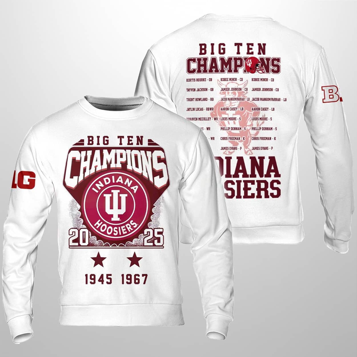Celebrate the season and a sensational victory with this sweater. Drenched in bold red and bursting with pride, this sweater is anything but subtle. The front shouts “BIG TEN CHAMPIONS” above the iconic Indiana Hoosiers logo, flanked by the championship years—2025, 1945, and 1967—because legends never go out of style. The left sleeve flexes the “BIG” like a badge of honor, while the back turns heads with a full roster of gridiron heroes, from QB Kurtis Bourke to CB Kobie Minor, printed over a ghosted Hoosiers emblem.