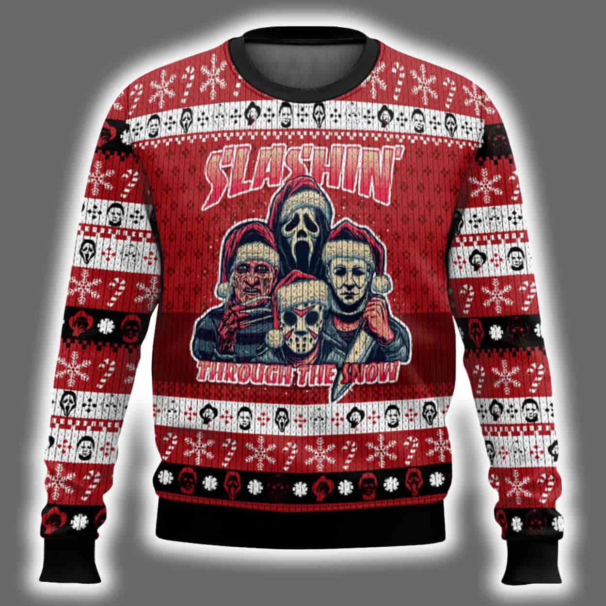 “Slashin’ Through the Snow” – The Horror Guys Slashin Through The Snow Ugly Christmas Sweater That Sleighs