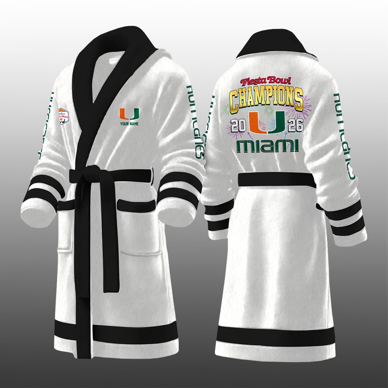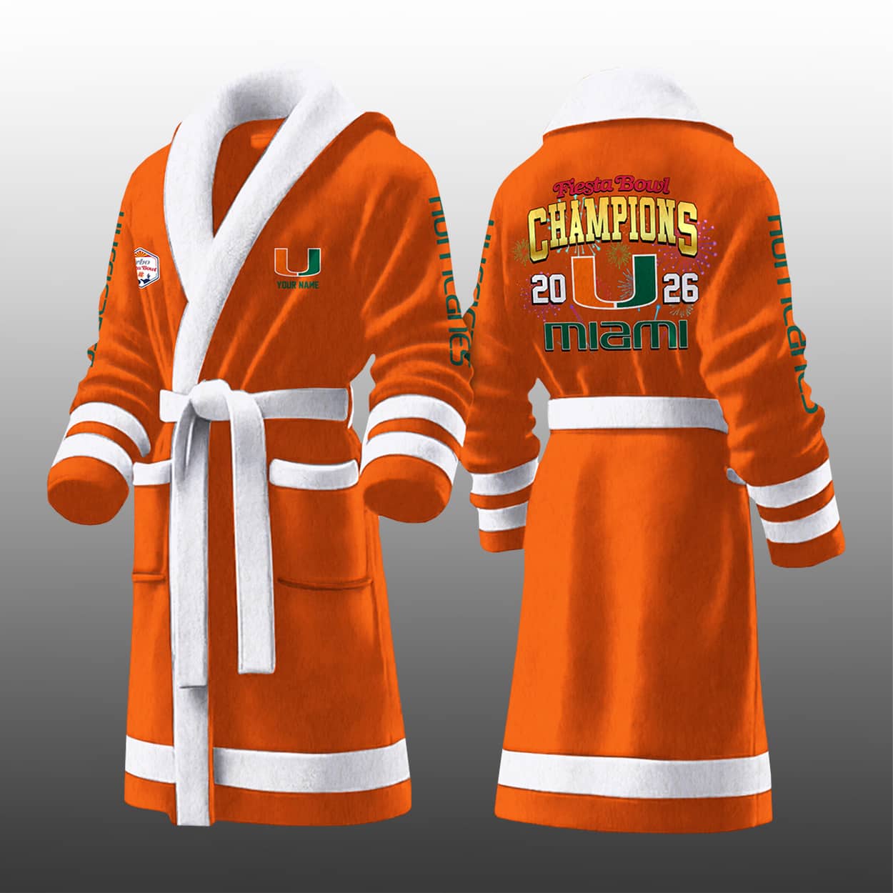 Celebrate victory in style with the Hurricanes Fiesta Bowl Champions 2026 Bathrobe—a bold tribute to triumph, team pride, and championship swagger.