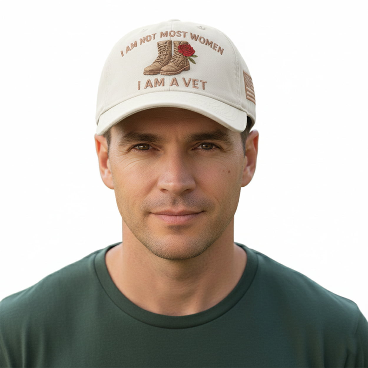 Crafted in crisp white with bold embroidery, the front features tan combat boots flanked by a red rose—symbolizing both grit and grace. Above the boots, the phrase “I AM NOT MOST WOMEN” challenges every cookie-cutter stereotype. Below, “I AM A VET” lands like a mic drop. On the side? A subdued American flag in tan, because flashy patriotism is for people who’ve never had sand in their boots or bureaucracy in their way.